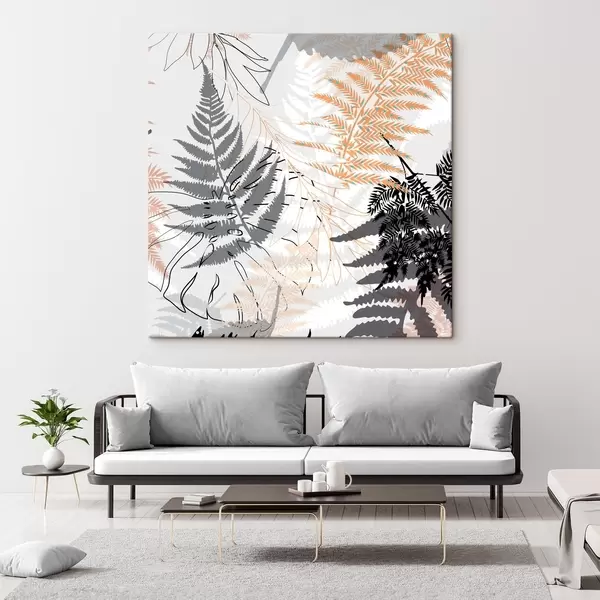Schilderij varen, abstracte bladeren, patroon, plat ontwerp, contrast, grijstinten, botanisch, overlay Art. s45101