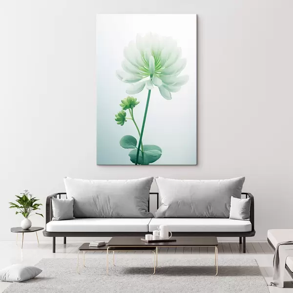 Schilderijen Witte klaver bloem met groene stengel en bladeren, zachte verlichting, schone achtergrond, minimalistische compositie, botanisch s45171