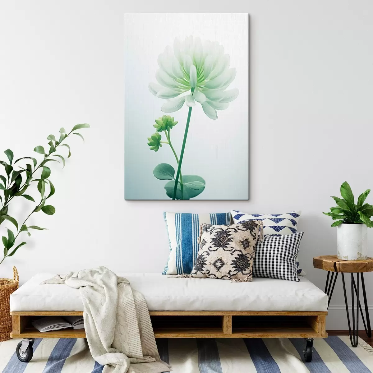 Schilderij Witte klaver bloem met groene stengel en bladeren, zachte verlichting, schone achtergrond, minimalistische compositie, botanisch Art. s45171