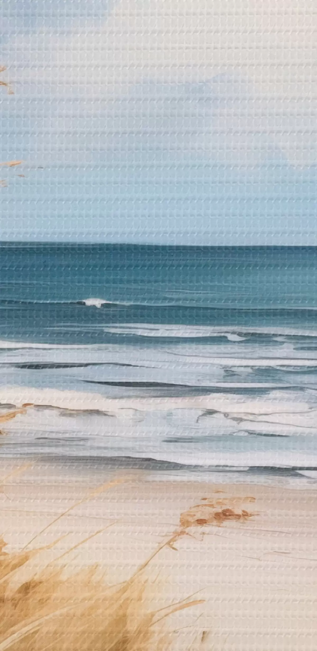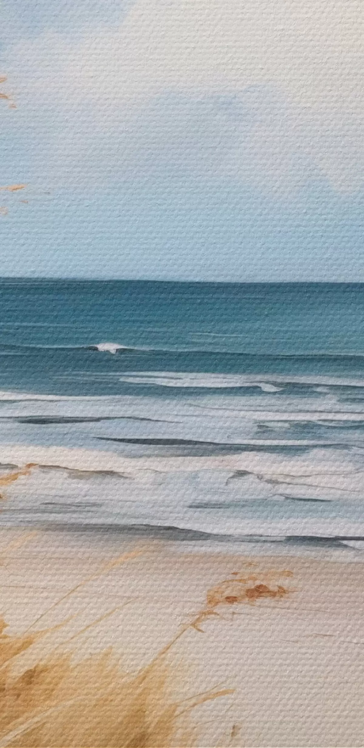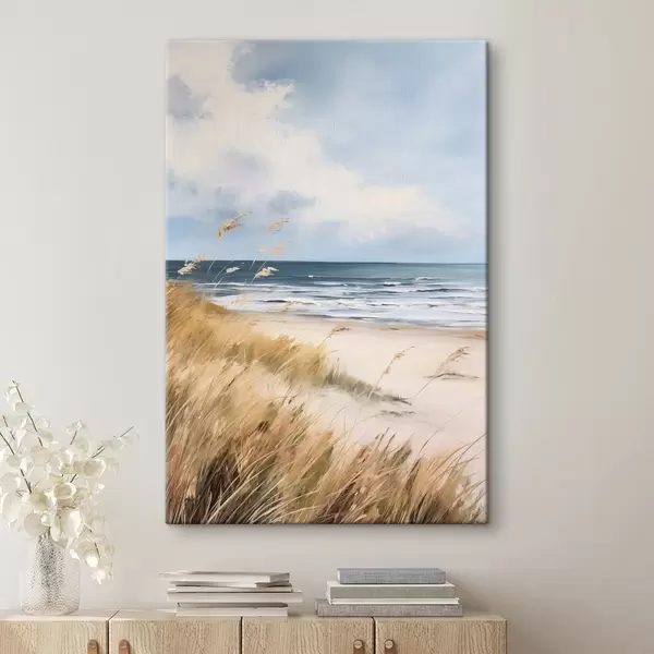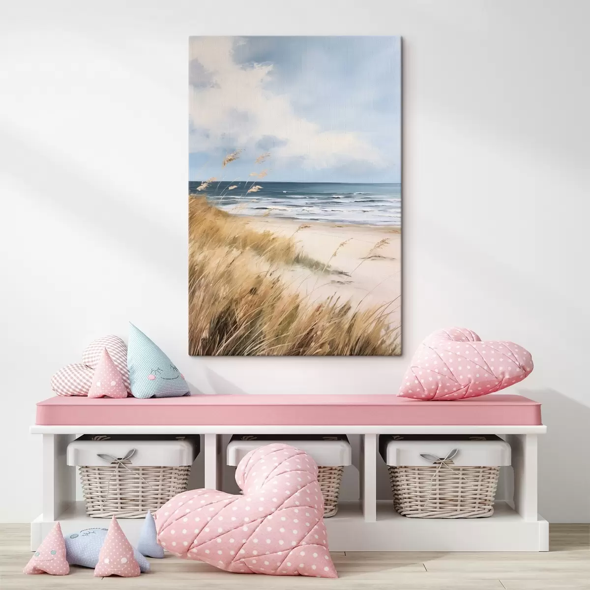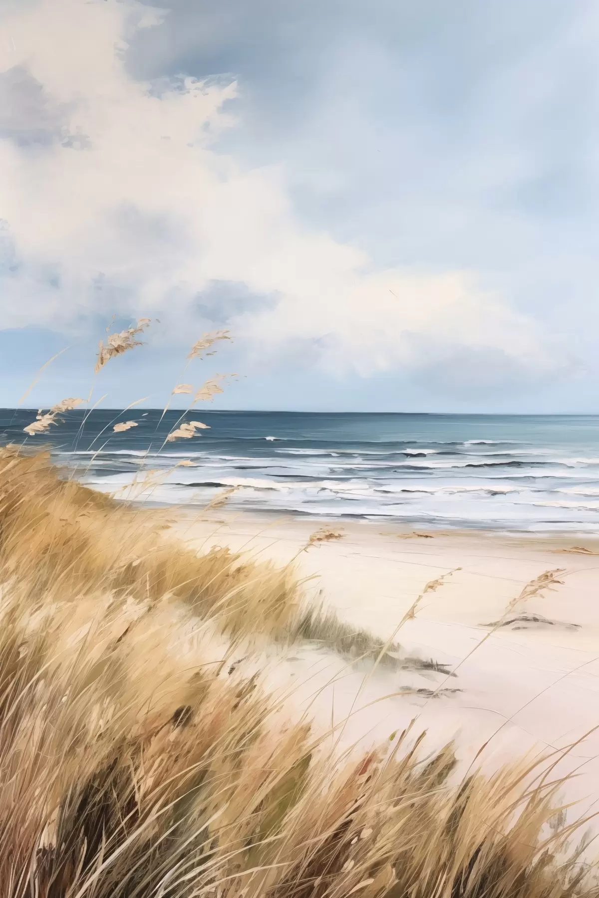 Schilderij Een zandstrand met hoog gras op de voorgrond, de oceaan met golven en een bewolkte lucht op de achtergrond Art. s45174