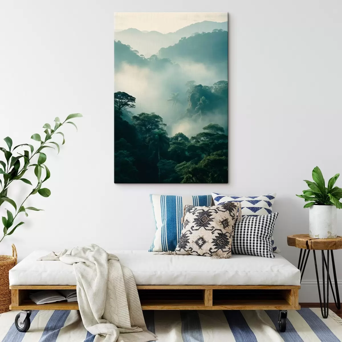 Schilderij Tropisch regenwoud met weelderige groene bomen en een dikke laag mist, waardoor een sfeervolle omgeving ontstaat Art. s45189