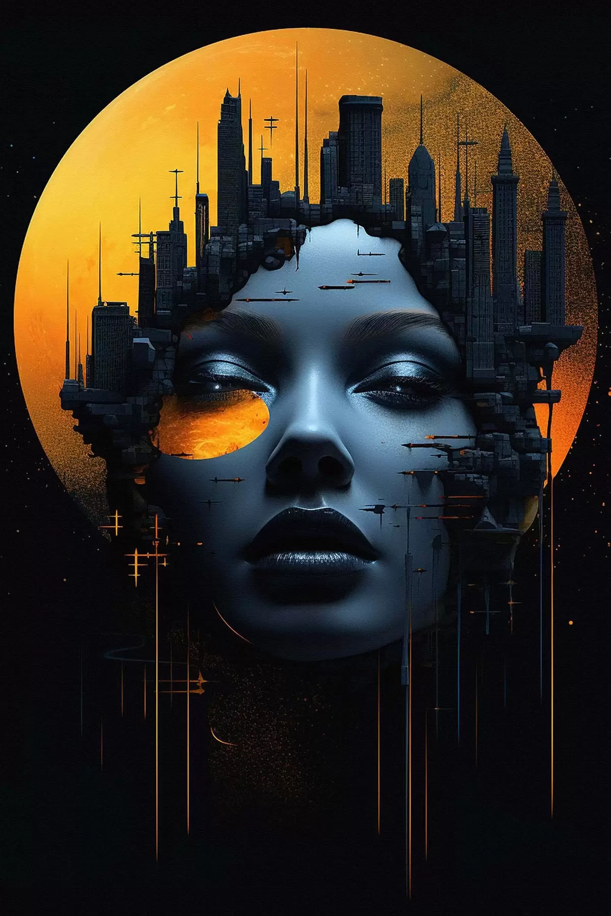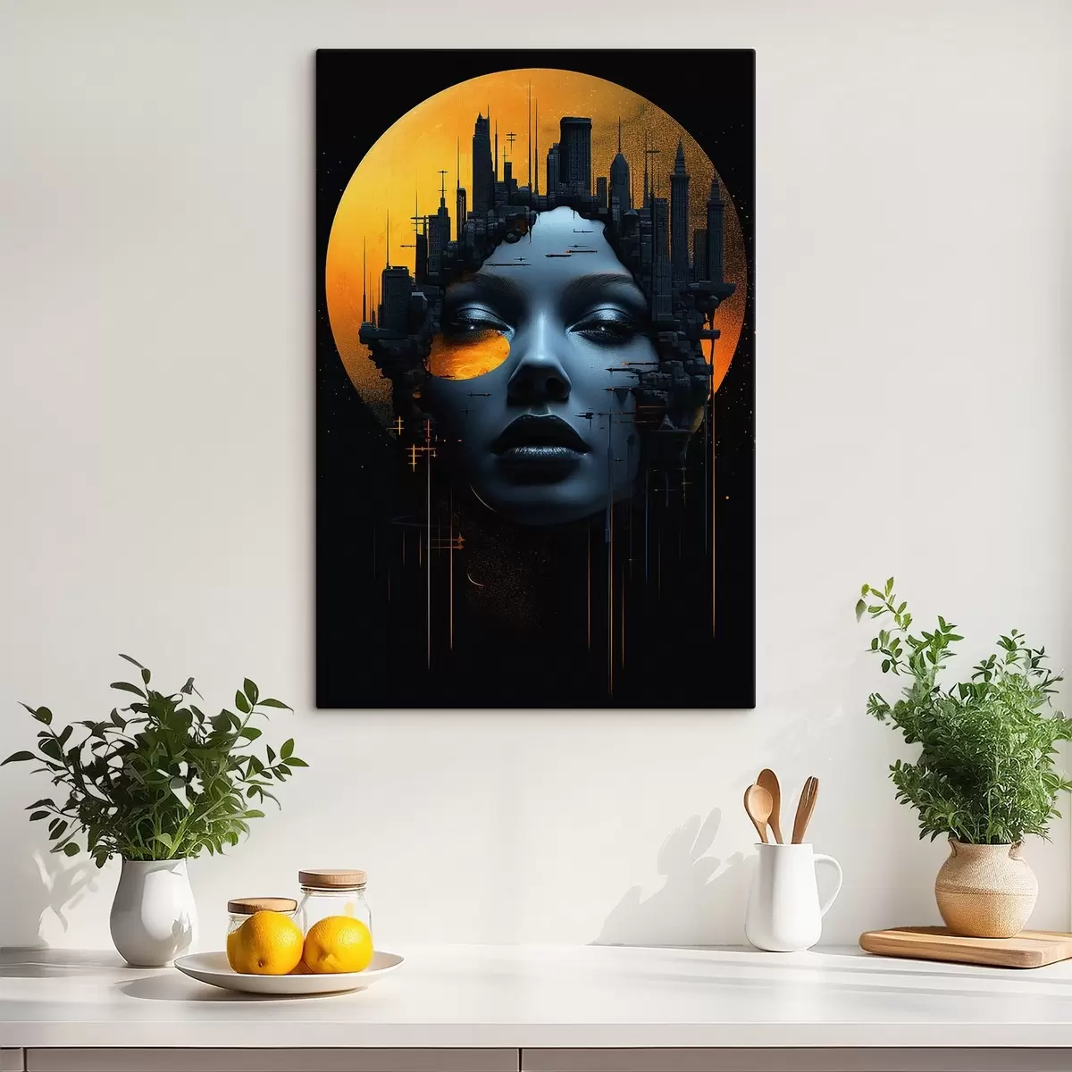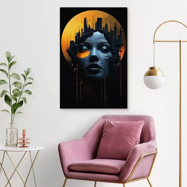 Schilderij Mensen, meisjesgezicht op een stadsachtergrond, abstract Art. s45341