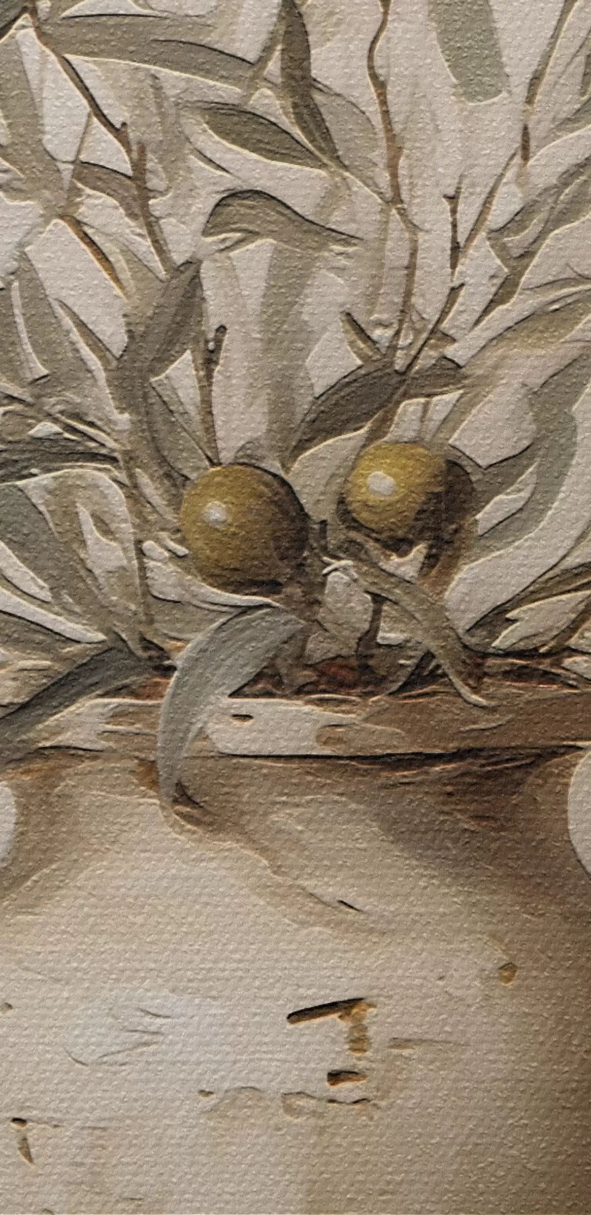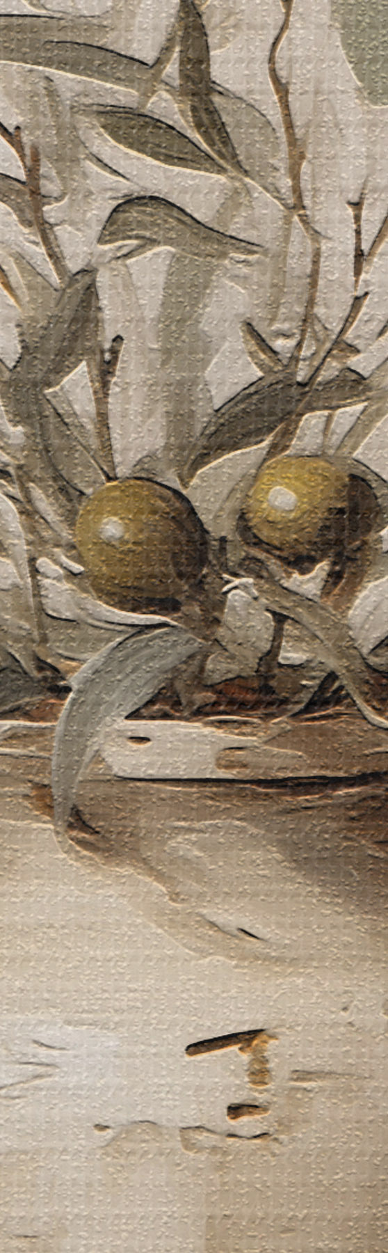 Het schilderij kan voorzichtig worden schoongeveegd met een droge zachte doek of spons; het wordt niet aanbevolen om natte producten te gebruiken. Het gebruik van een vochtige spons is alleen toegestaan als het schilderij gevernist is.