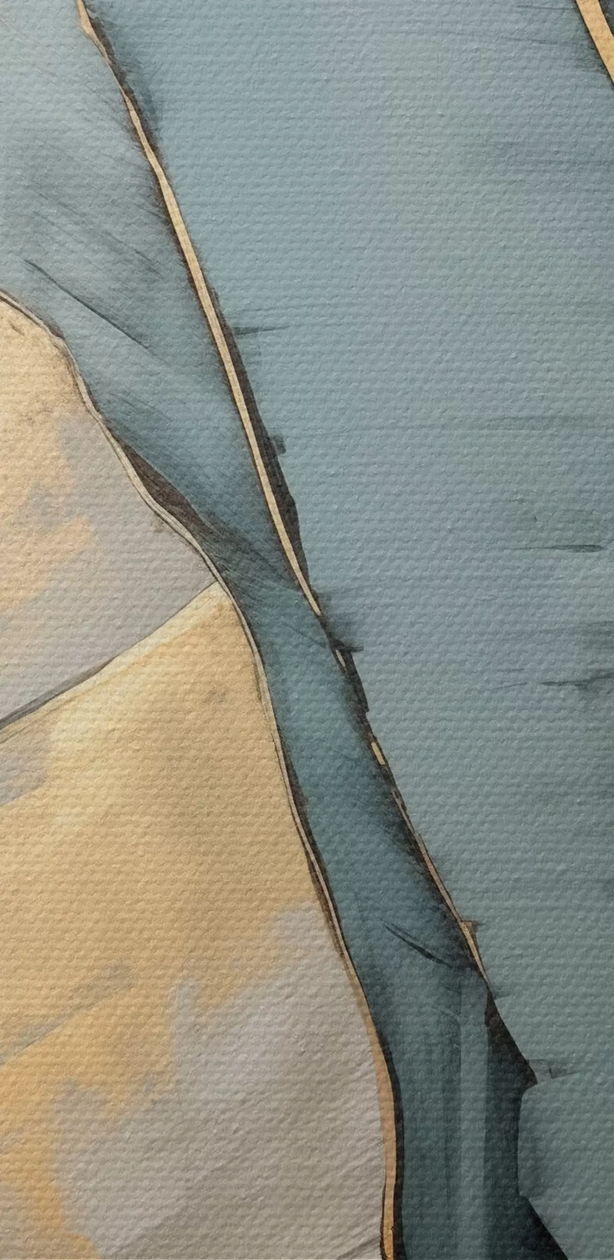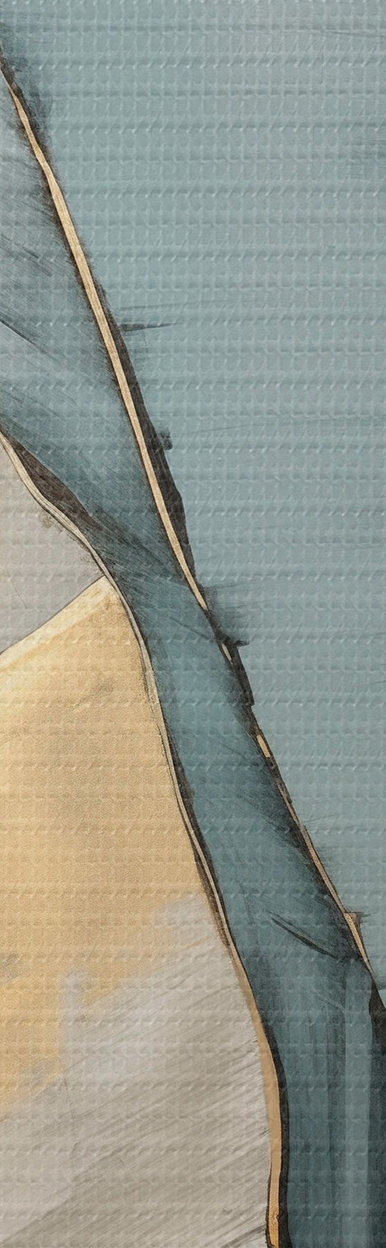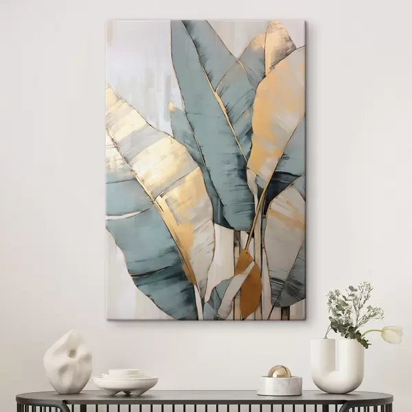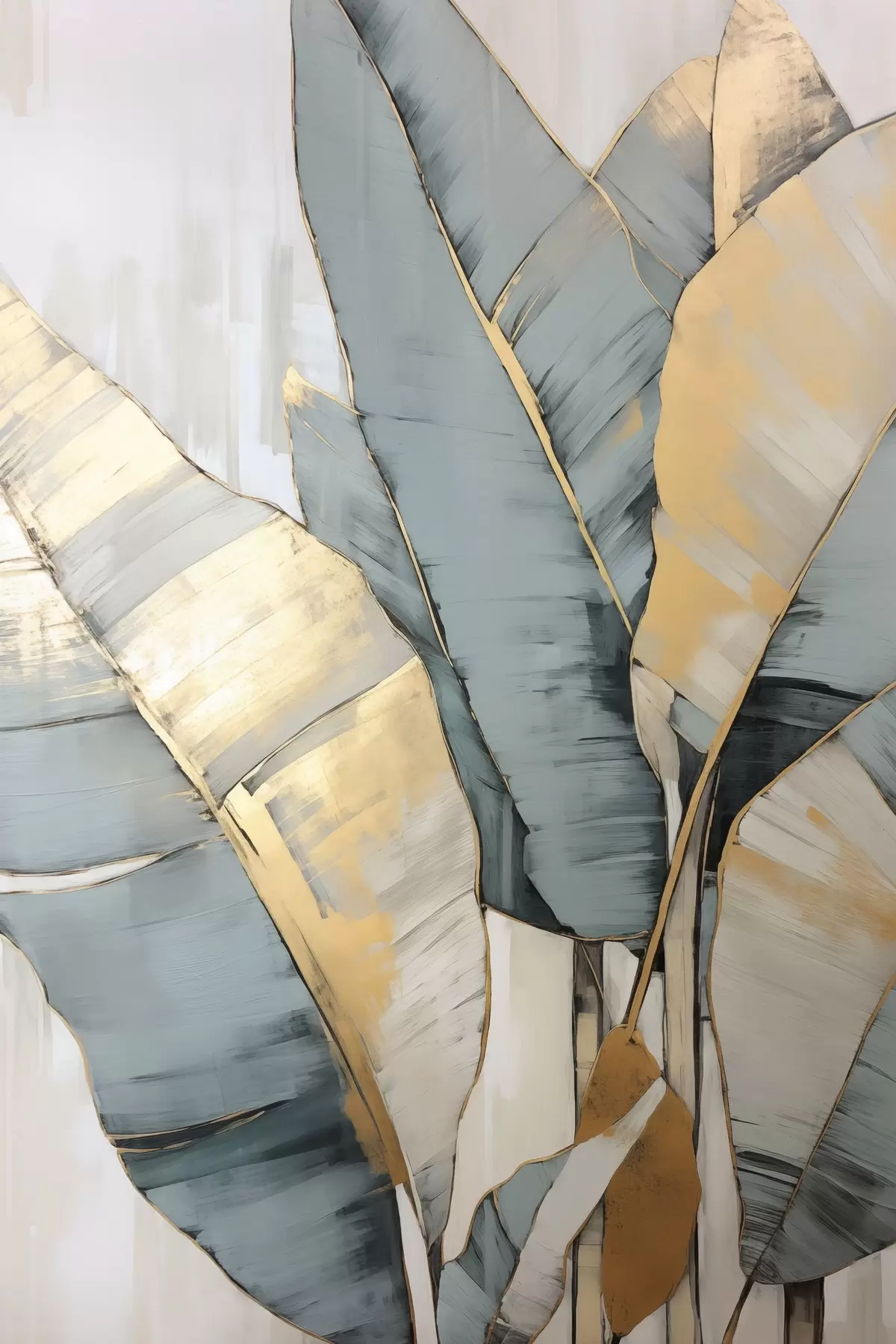 Schilderij Gedempte blauwe, grijze en gele bananenbladeren met zichtbare penseelstreken, op een witte abstracte achtergrond Art. s45552