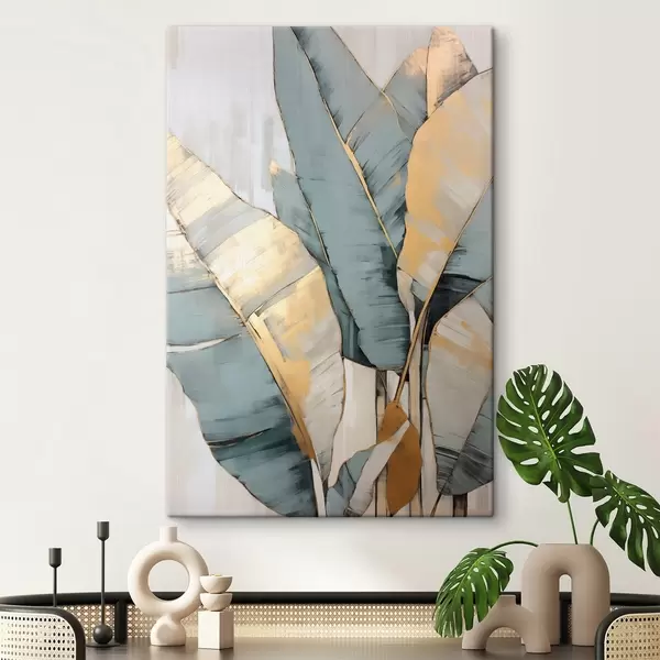 Schilderij Gedempte blauwe, grijze en gele bananenbladeren met zichtbare penseelstreken, op een witte abstracte achtergrond Art. s45552