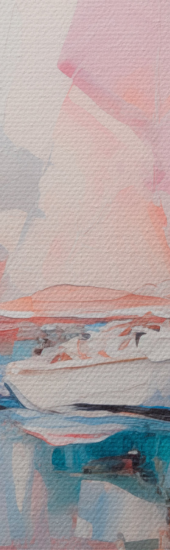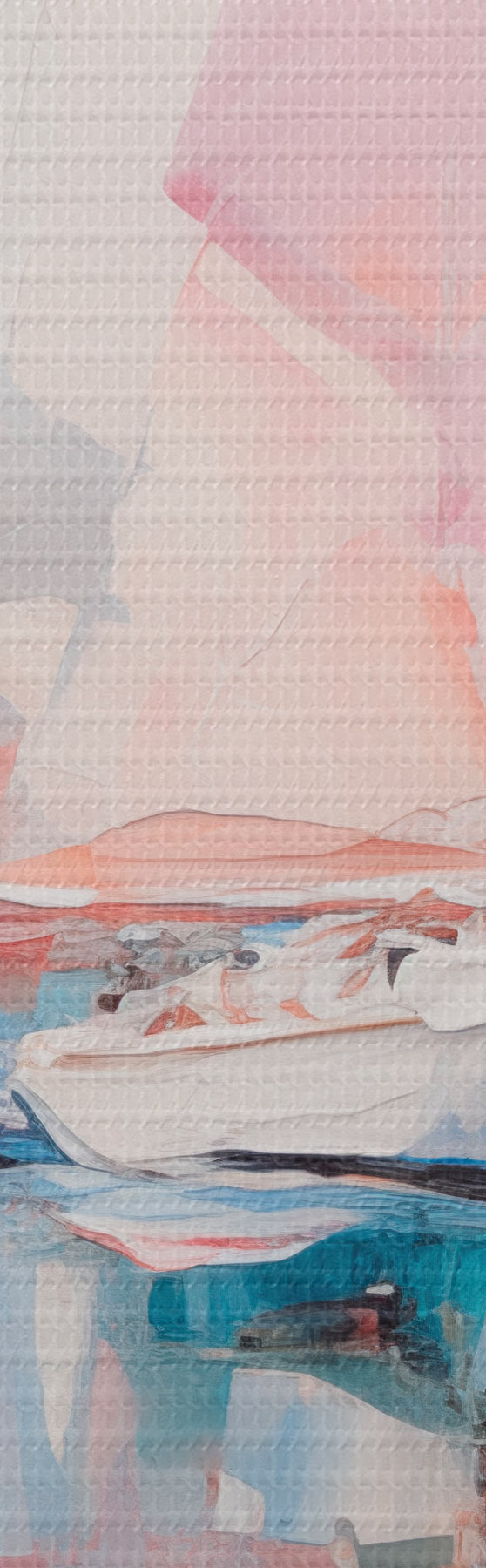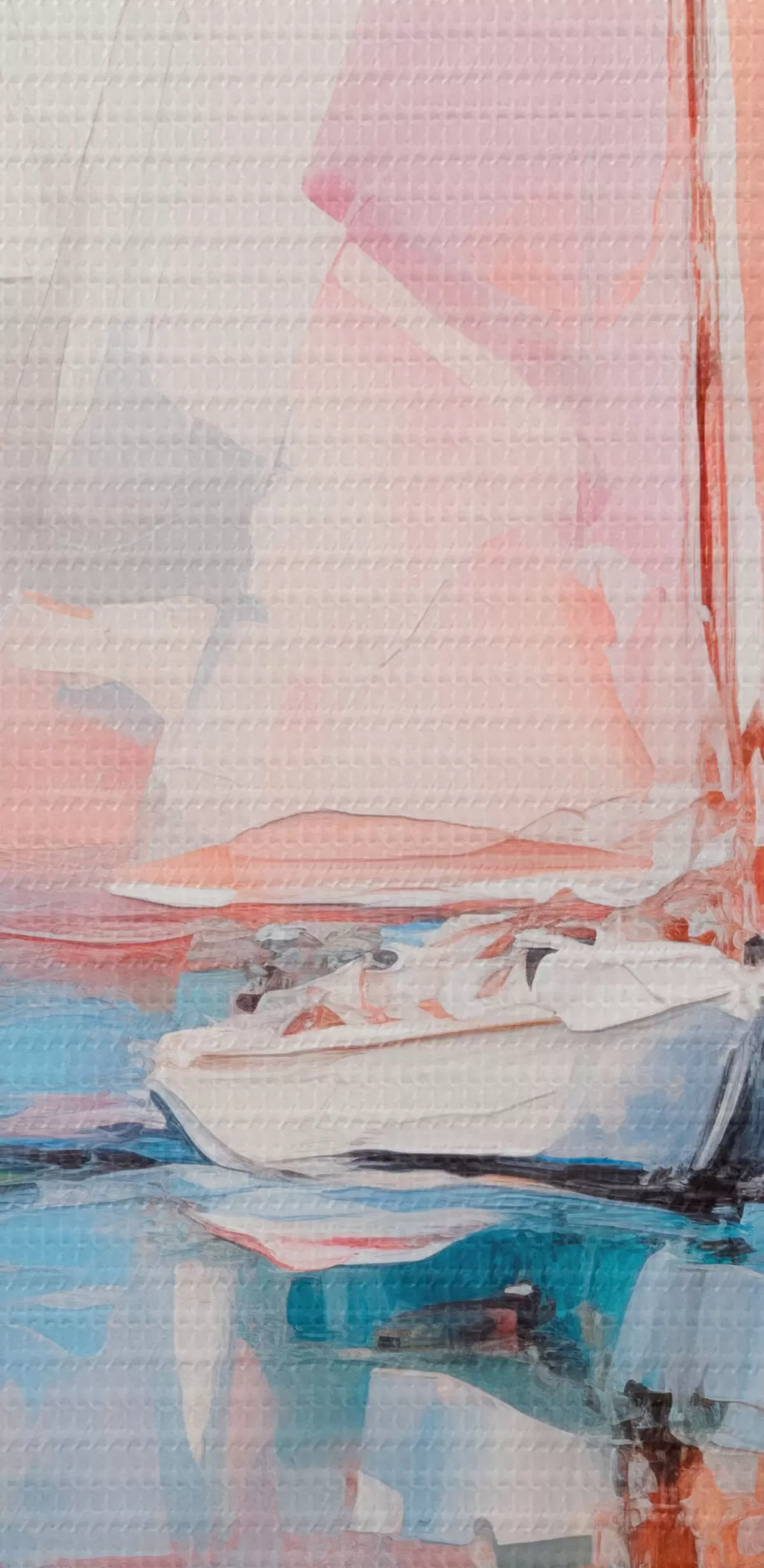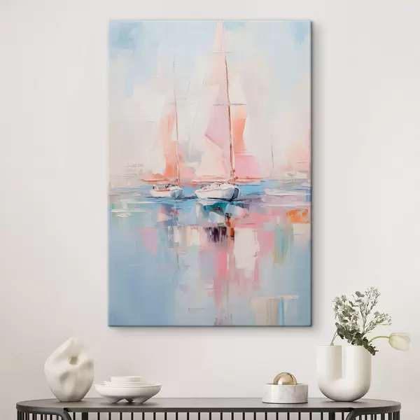 Schilderij Zeilboten met roze zeilen drijvend op een kalme zee, reflecties van de boten in het water, zachte pastelkleuren Art. s45557
