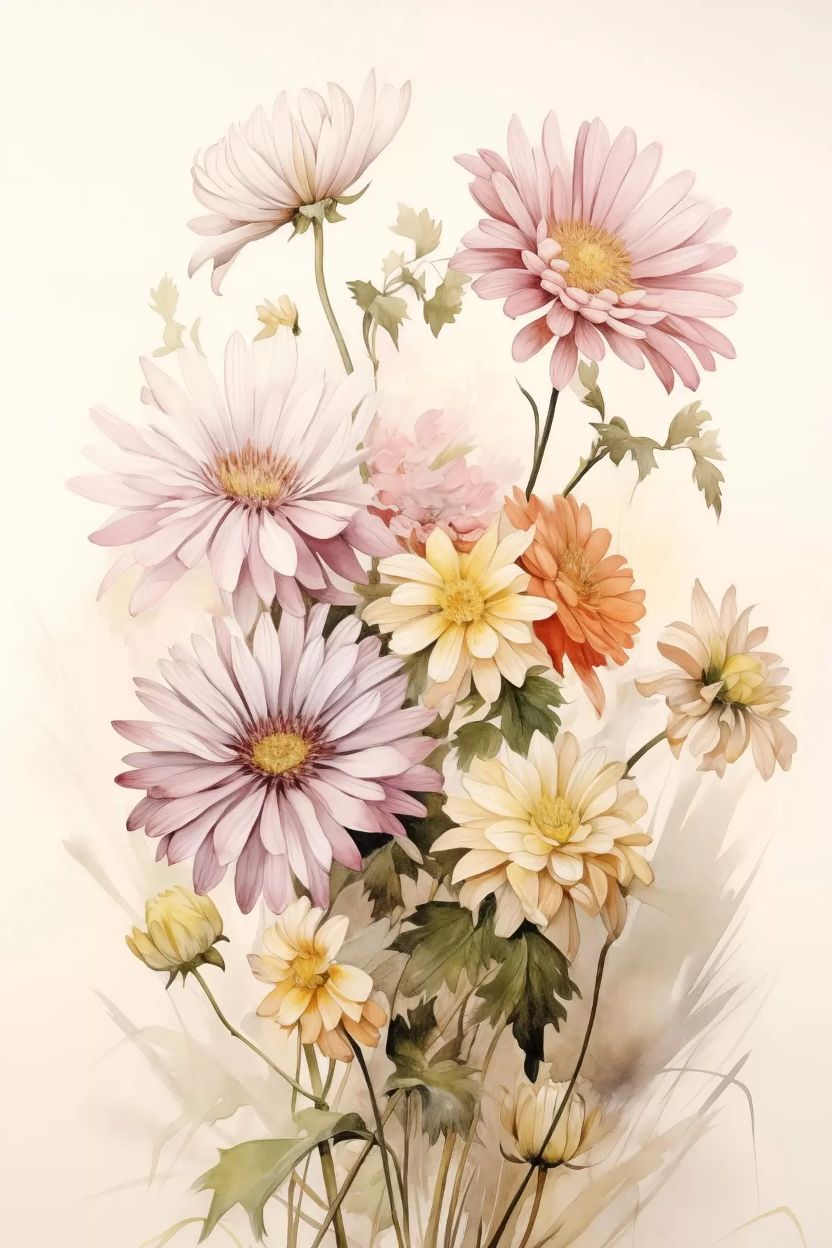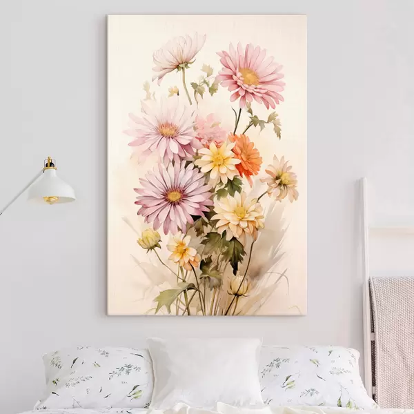 Schilderij Een boeket kleurrijke bloemen, zachte aquarelstijl, op een lichte achtergrond Art. s45559