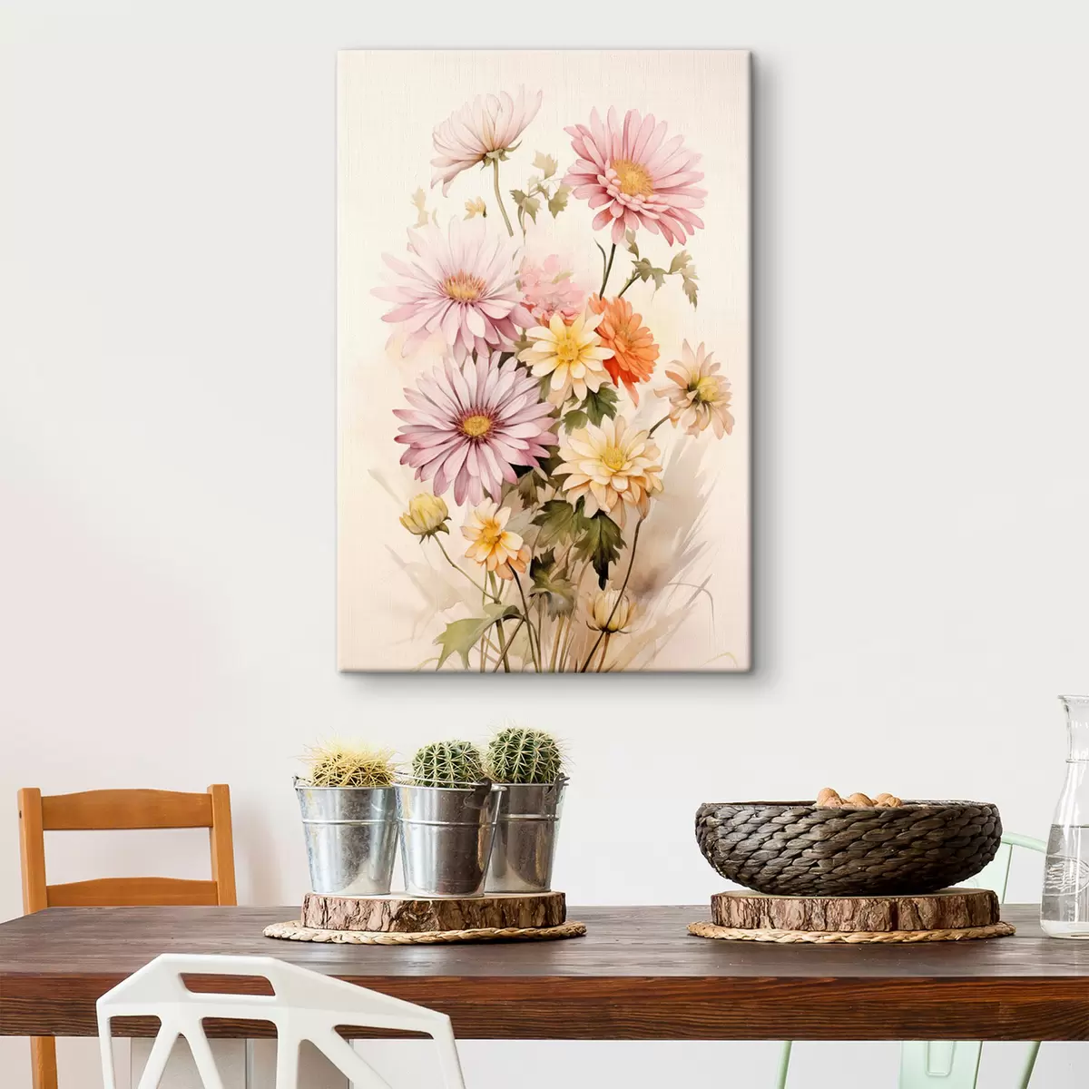Schilderijen Een boeket kleurrijke bloemen, zachte aquarelstijl, op een lichte achtergrond s45559