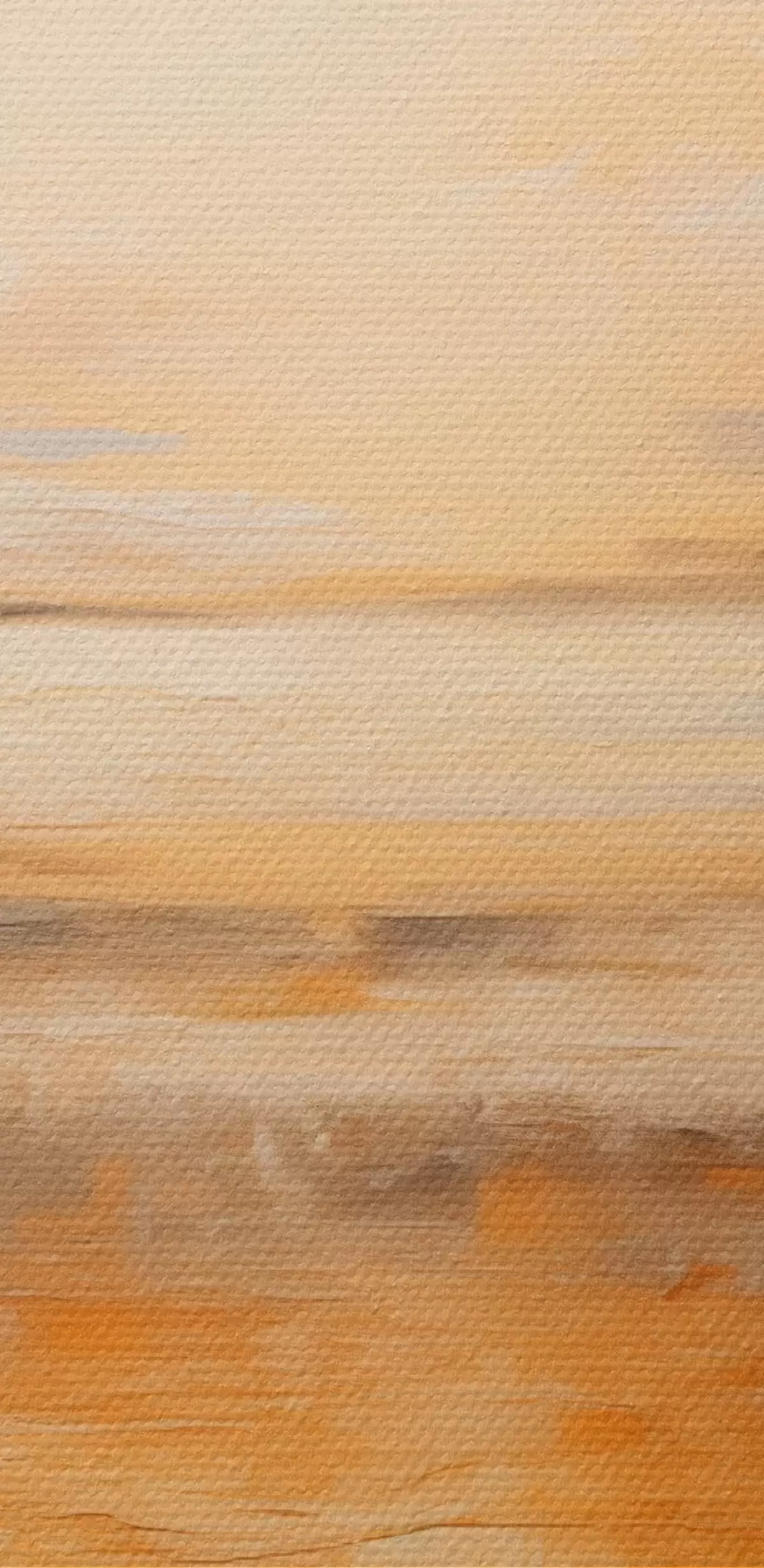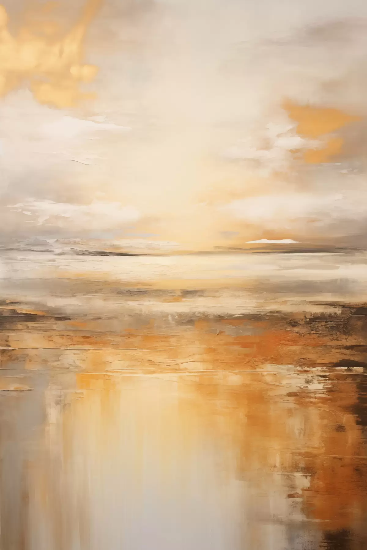 Schilderij Een abstract schilderij van een strandlandschap met een kalme oceaan, oranje zand en een bewolkte lucht met zon Art. s45567