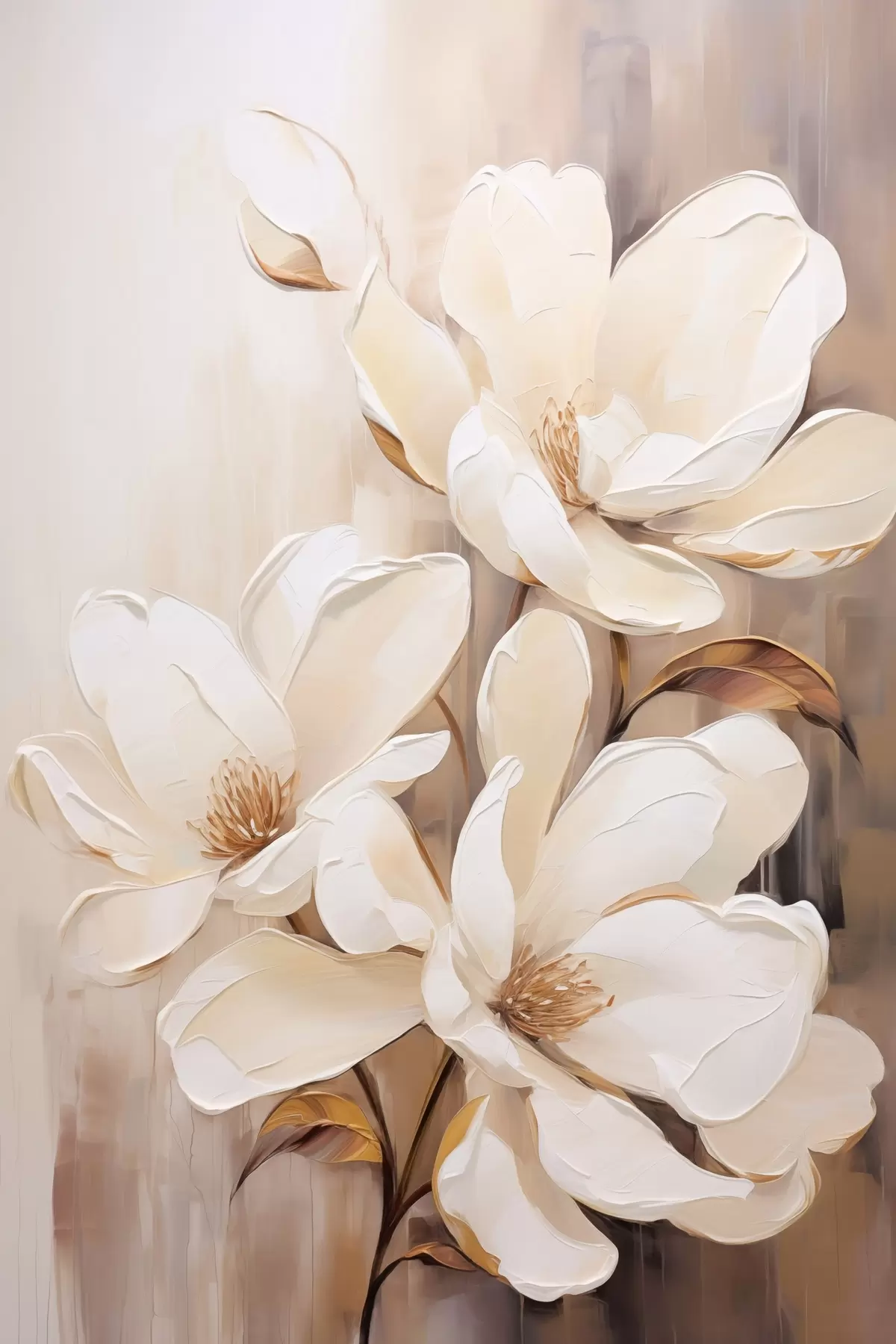 Schilderij Witte magnolia bloemen tegen een zachte, onscherpe achtergrond van beige en bruine tinten, elegante bloemencompositie Art. s45571