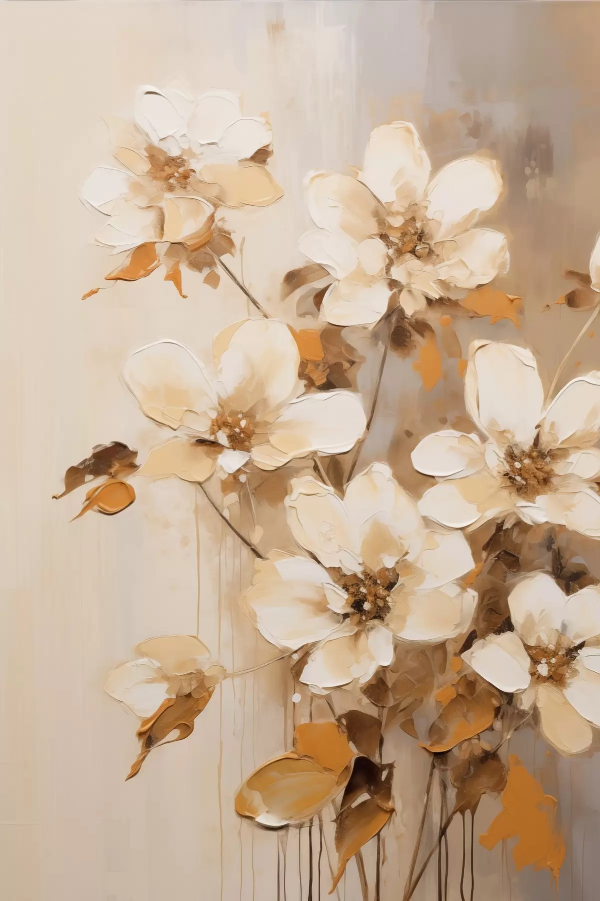 Schilderijen Witte bloemen met oranje bladeren, fijne penseelstreken, bloemstuk, botanische kunst s45574