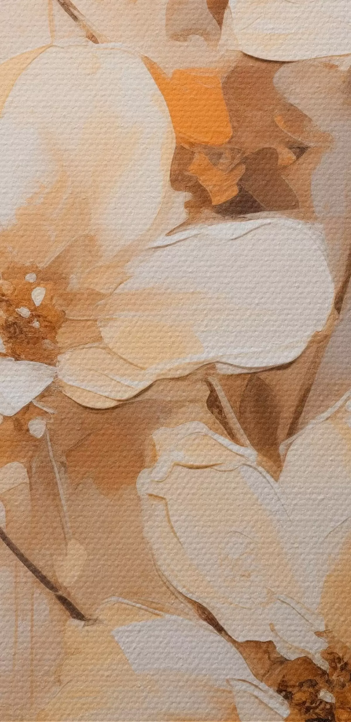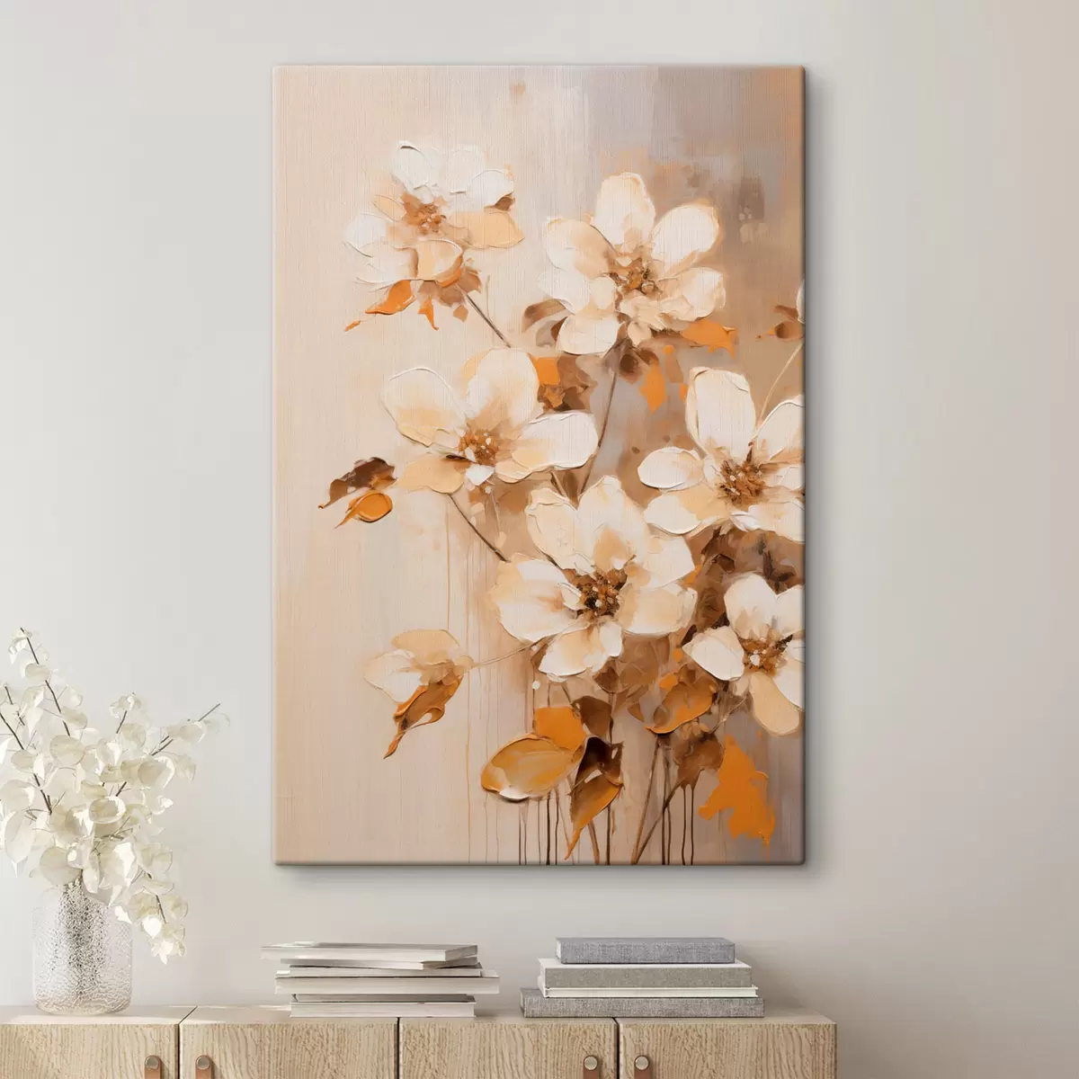 Schilderij Witte bloemen met oranje bladeren, fijne penseelstreken, bloemstuk, botanische kunst Art. s45574
