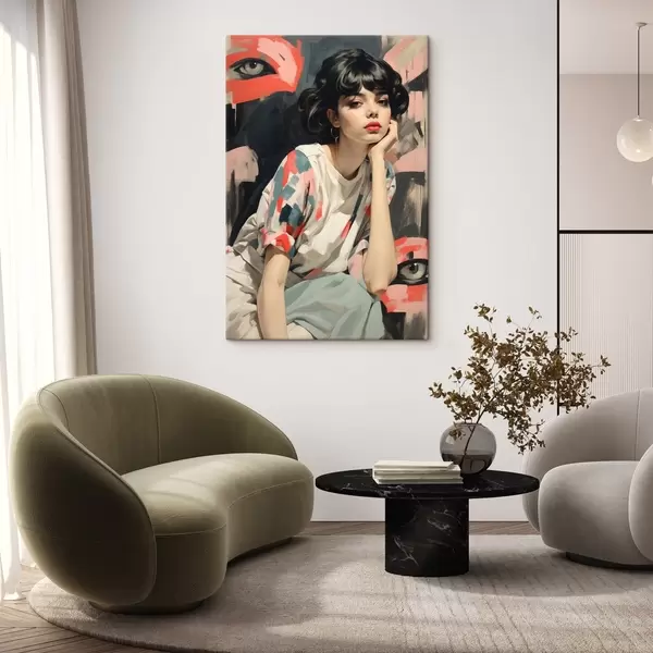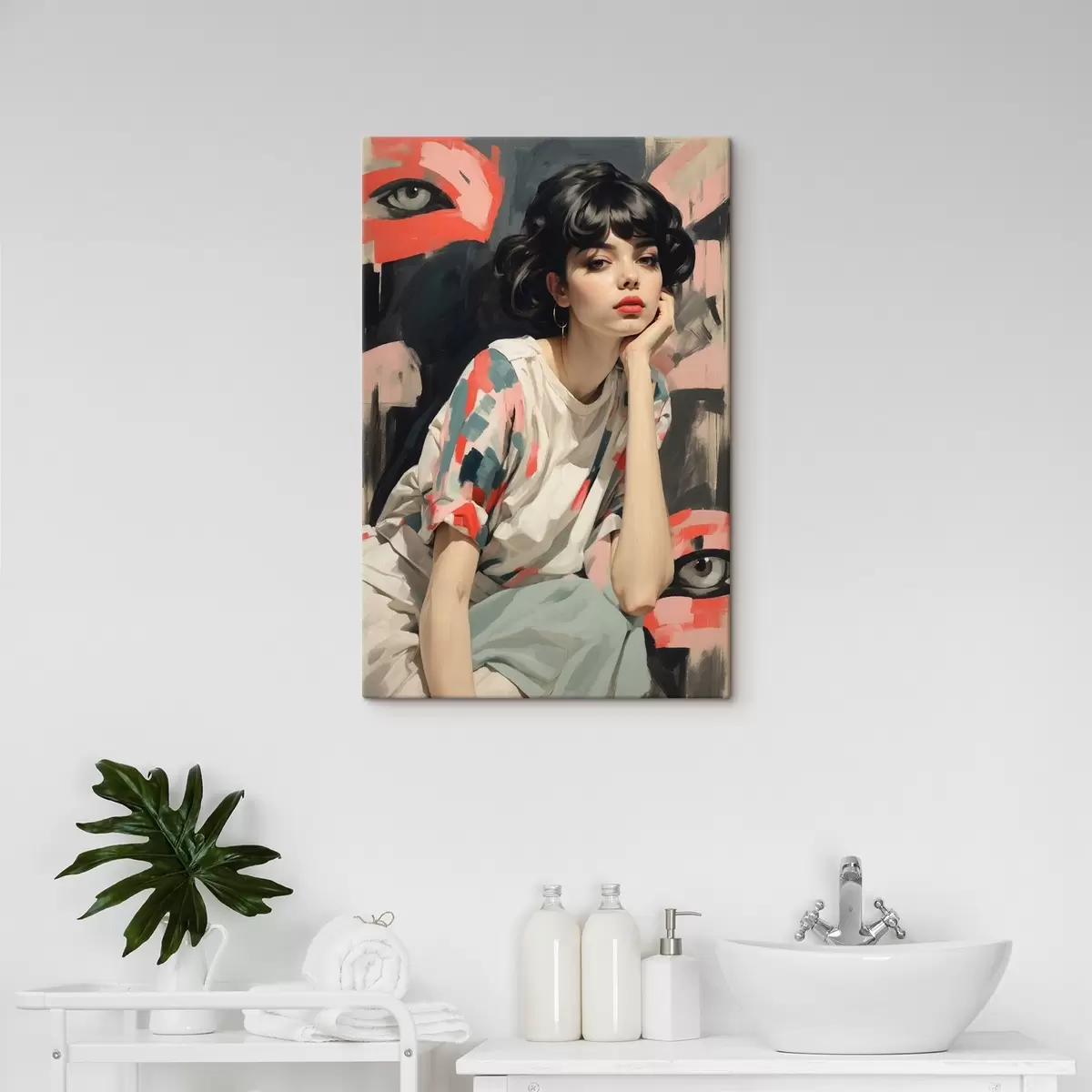 Schilderij Portret van een meisje tegen een achtergrond met ogen en abstracte streken Art. s45623