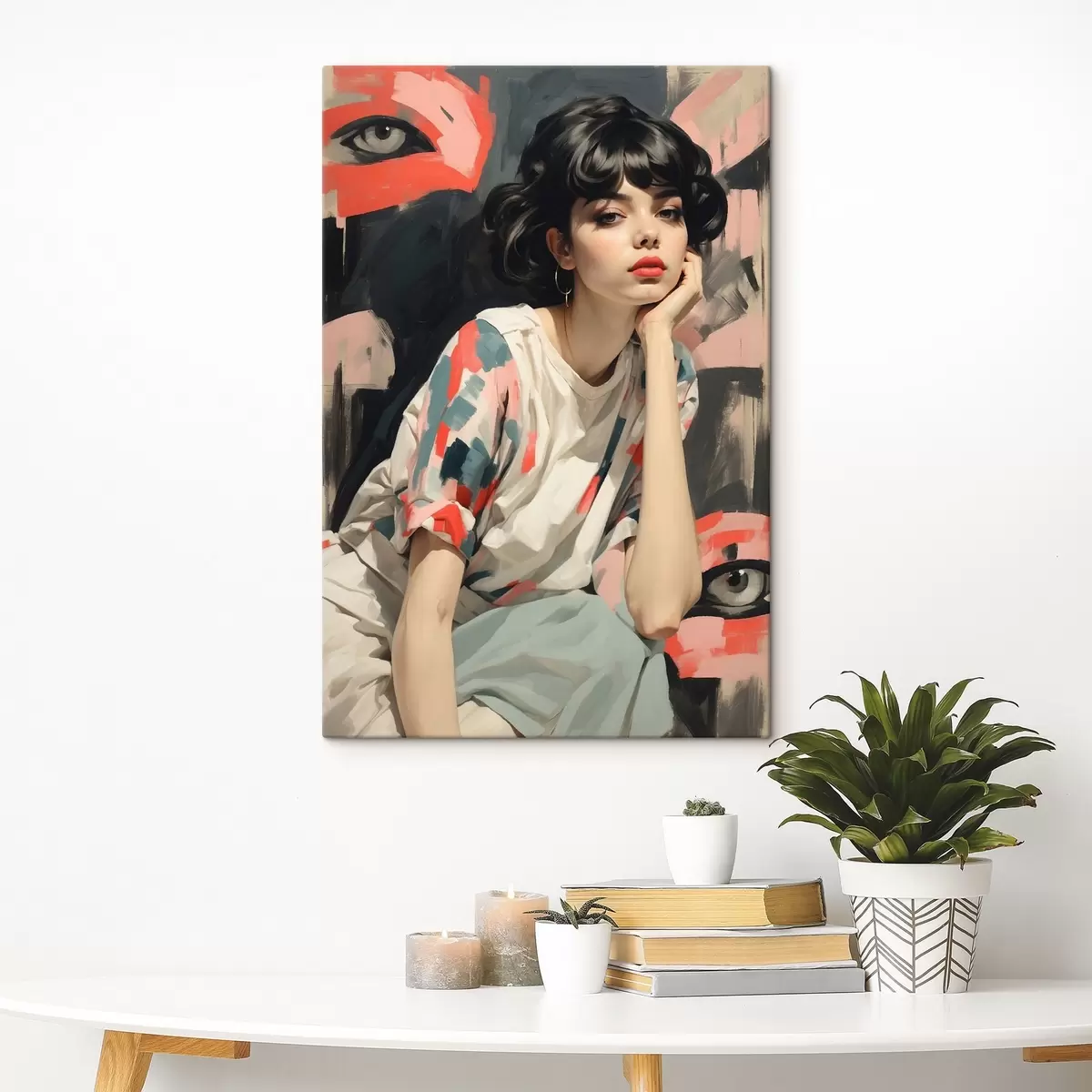 Schilderijen Portret van een meisje tegen een achtergrond met ogen en abstracte streken s45623