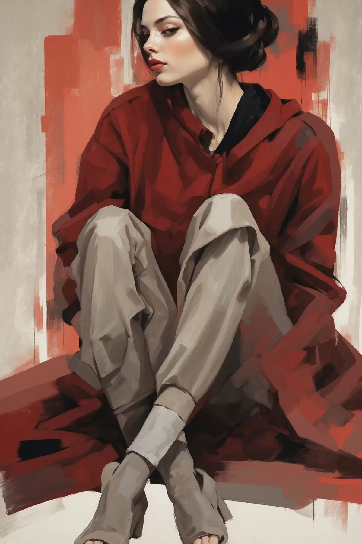 Schilderij Meisje in een rode mantel zittend met gevouwen benen Art. s45624
