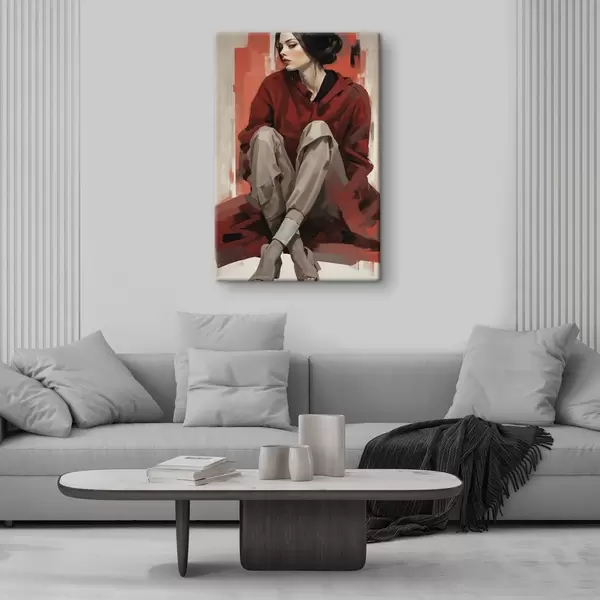 Schilderijen Meisje in een rode mantel zittend met gevouwen benen s45624