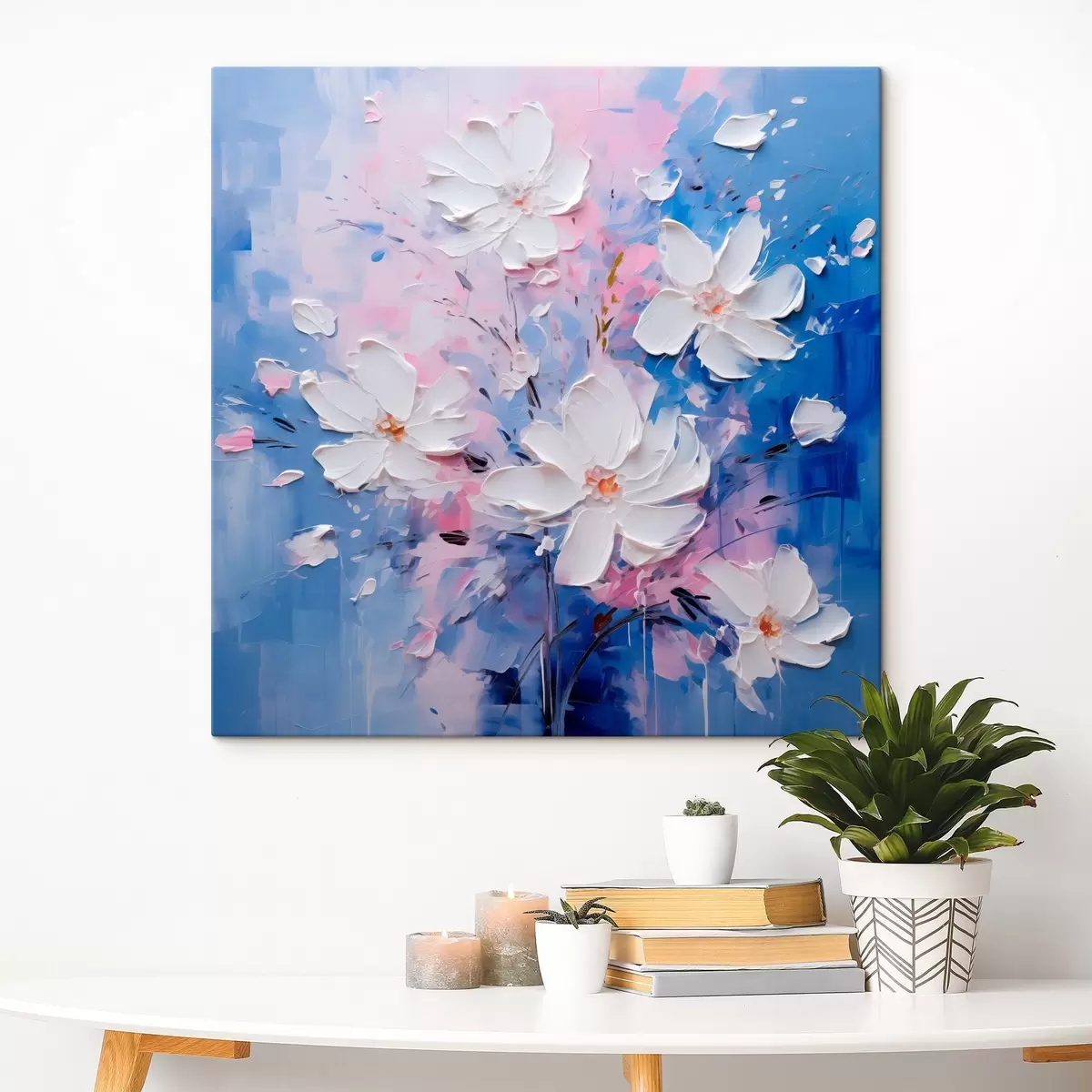 Schilderijen Volumetrische bloemen op een blauwe achtergrond in impasto stijl s45648