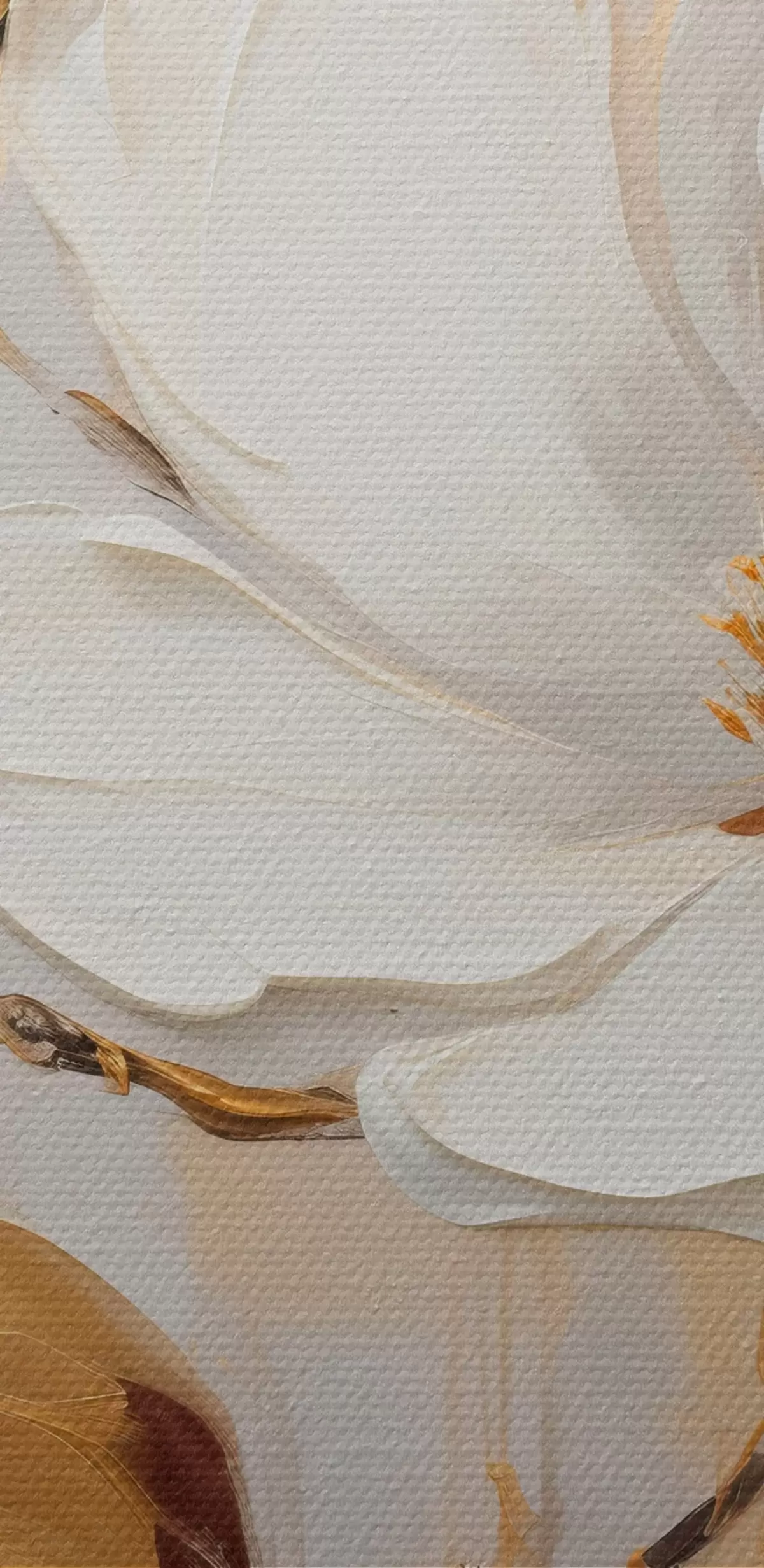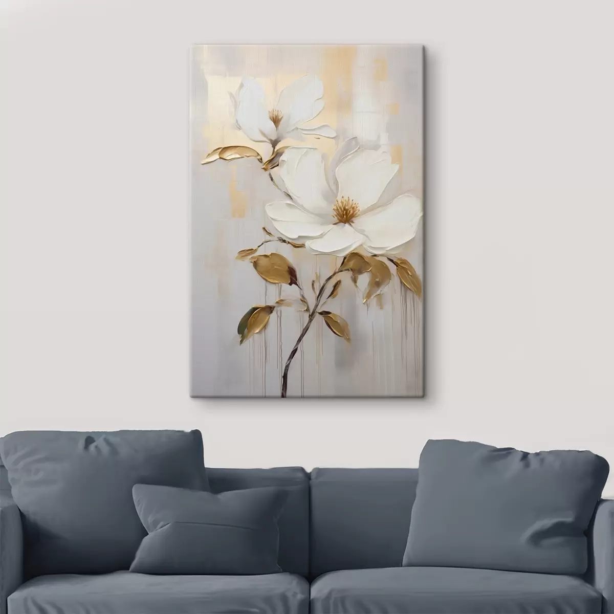 Schilderij Twee witte bloemen met geeloranje bladeren op een lichte achtergrond Art. s45691