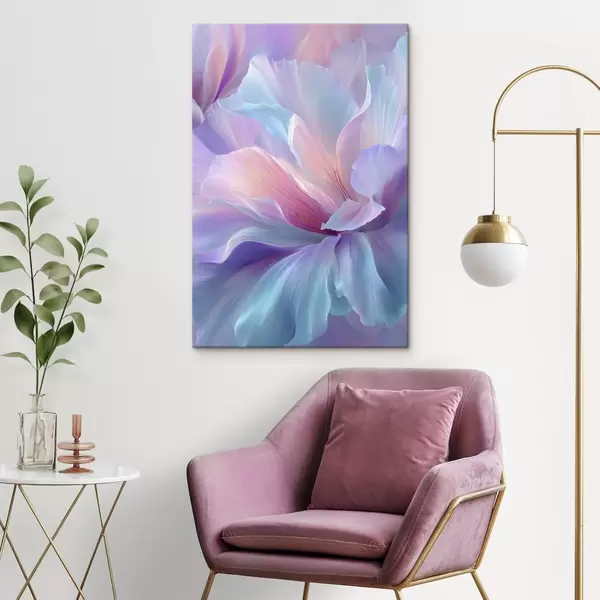 Schilderij een delicate fantasiebloem met bloemblaadjes in tinten paars, blauw en roze. Art. s45710
