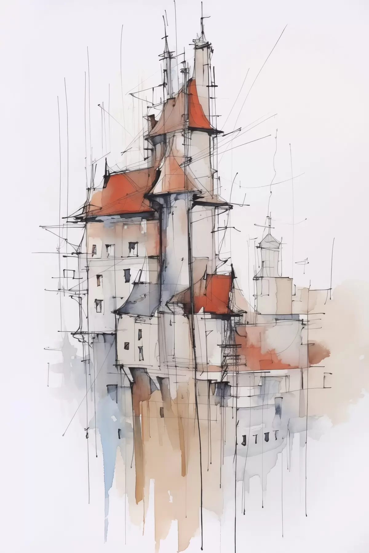 Schilderijen Huizen imitatie schets en aquarel s45764