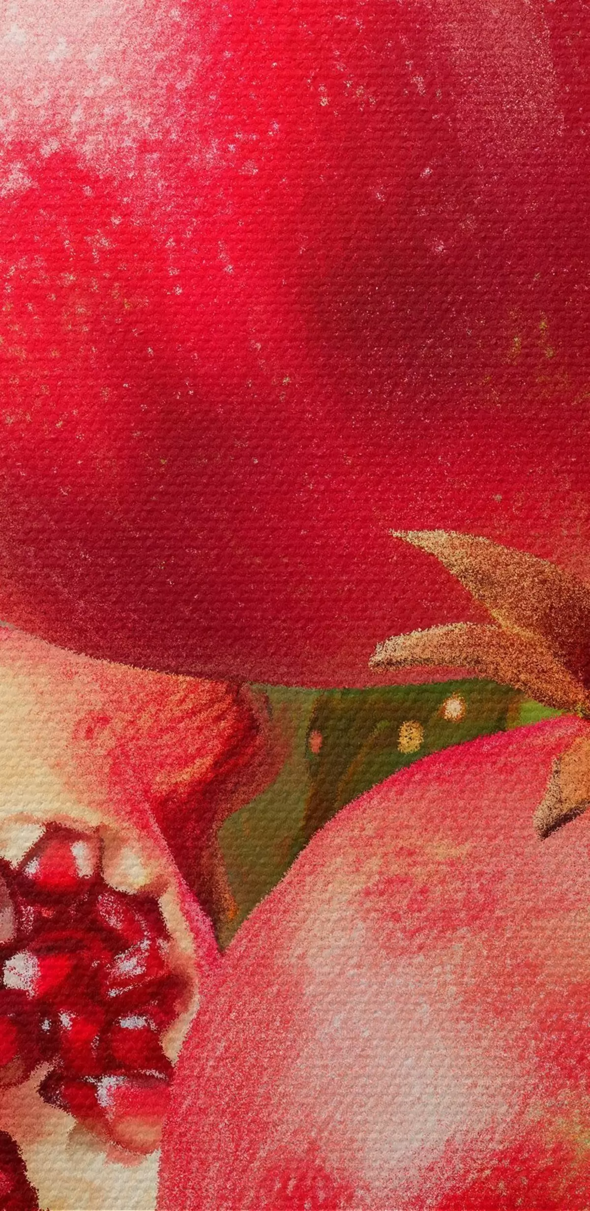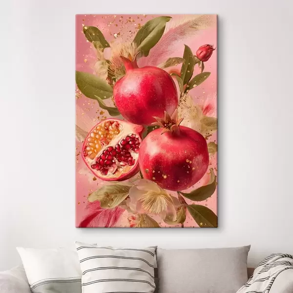 Schilderij Rijpe granaatappels op een roze achtergrond met bladeren en vlekjes Art. s45868