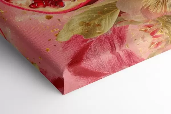 Schilderij Rijpe granaatappels op een roze achtergrond met bladeren en vlekjes Art. s45868
