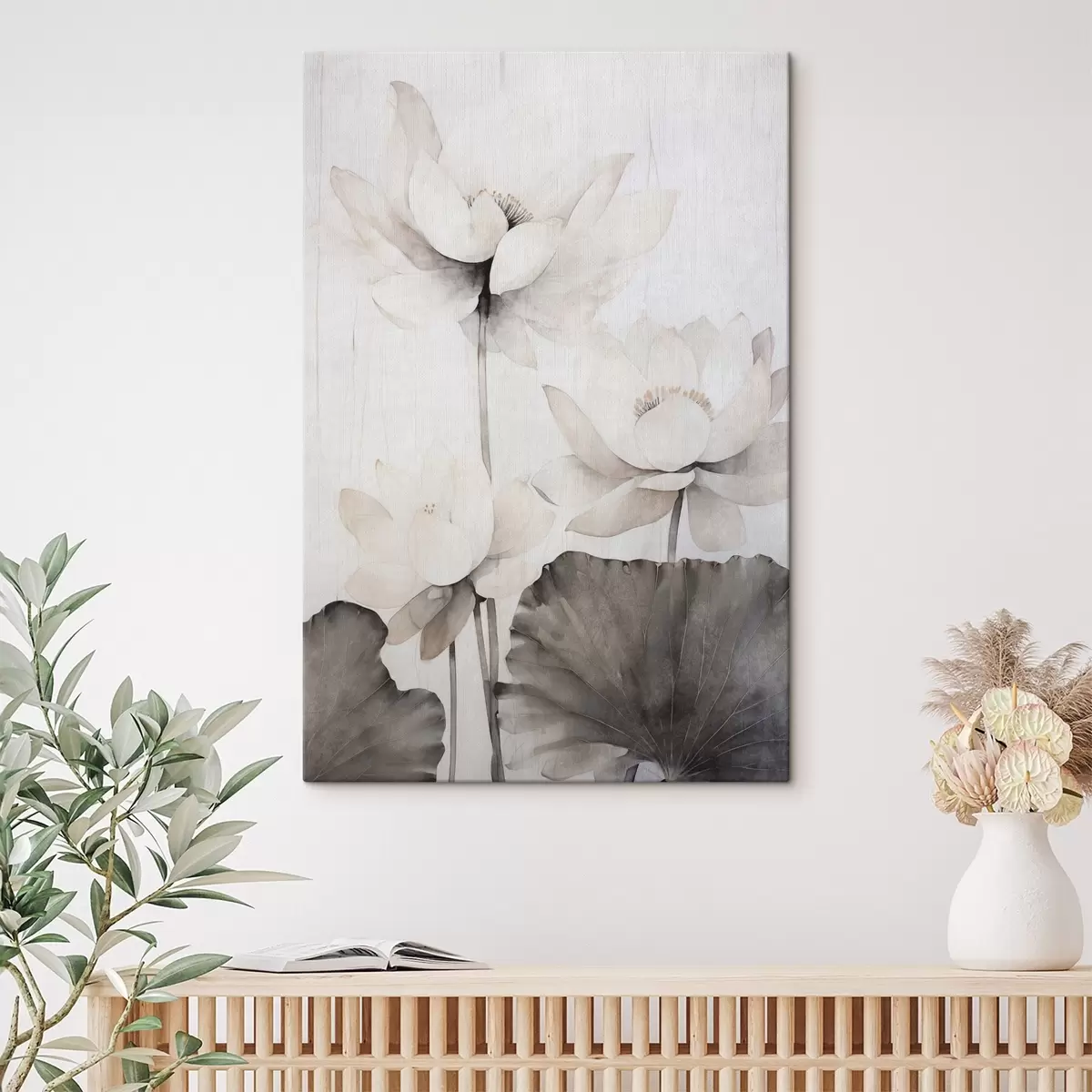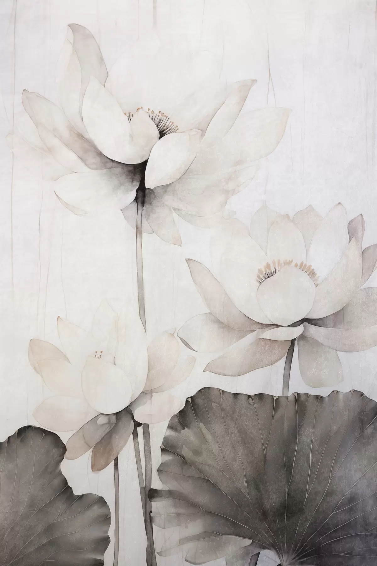 Schilderijen Witte lotusbloemen met textuur en donkere bladeren, lichte achtergrond, minimalistisch ontwerp s45936