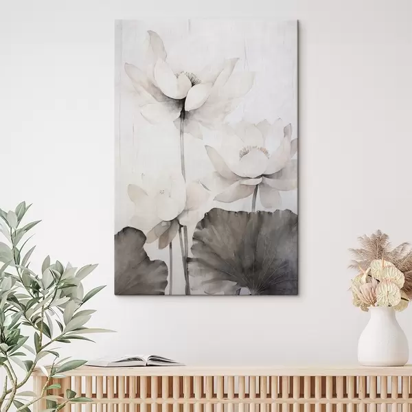 Schilderij Witte lotusbloemen met textuur en donkere bladeren, lichte achtergrond, minimalistisch ontwerp Art. s45936