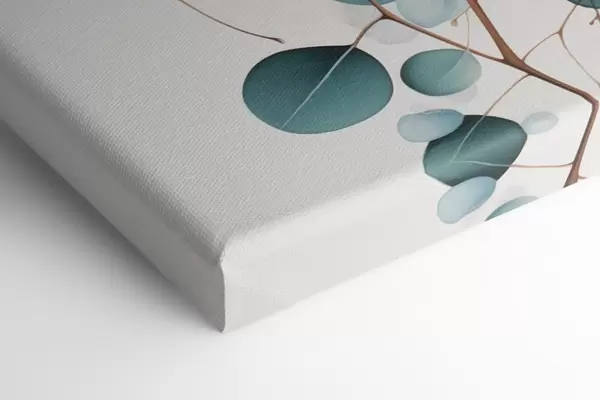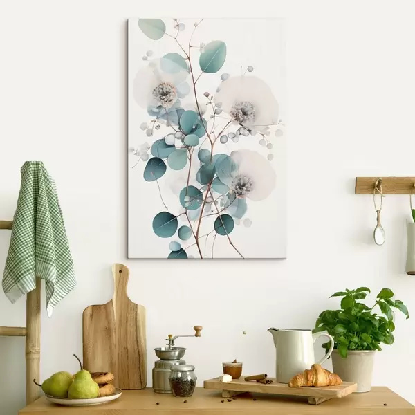 Schilderij Eucalyptus abstracte bloemen met witte bloemblaadjes, gedempte groene bladeren aan takken Art. s45946