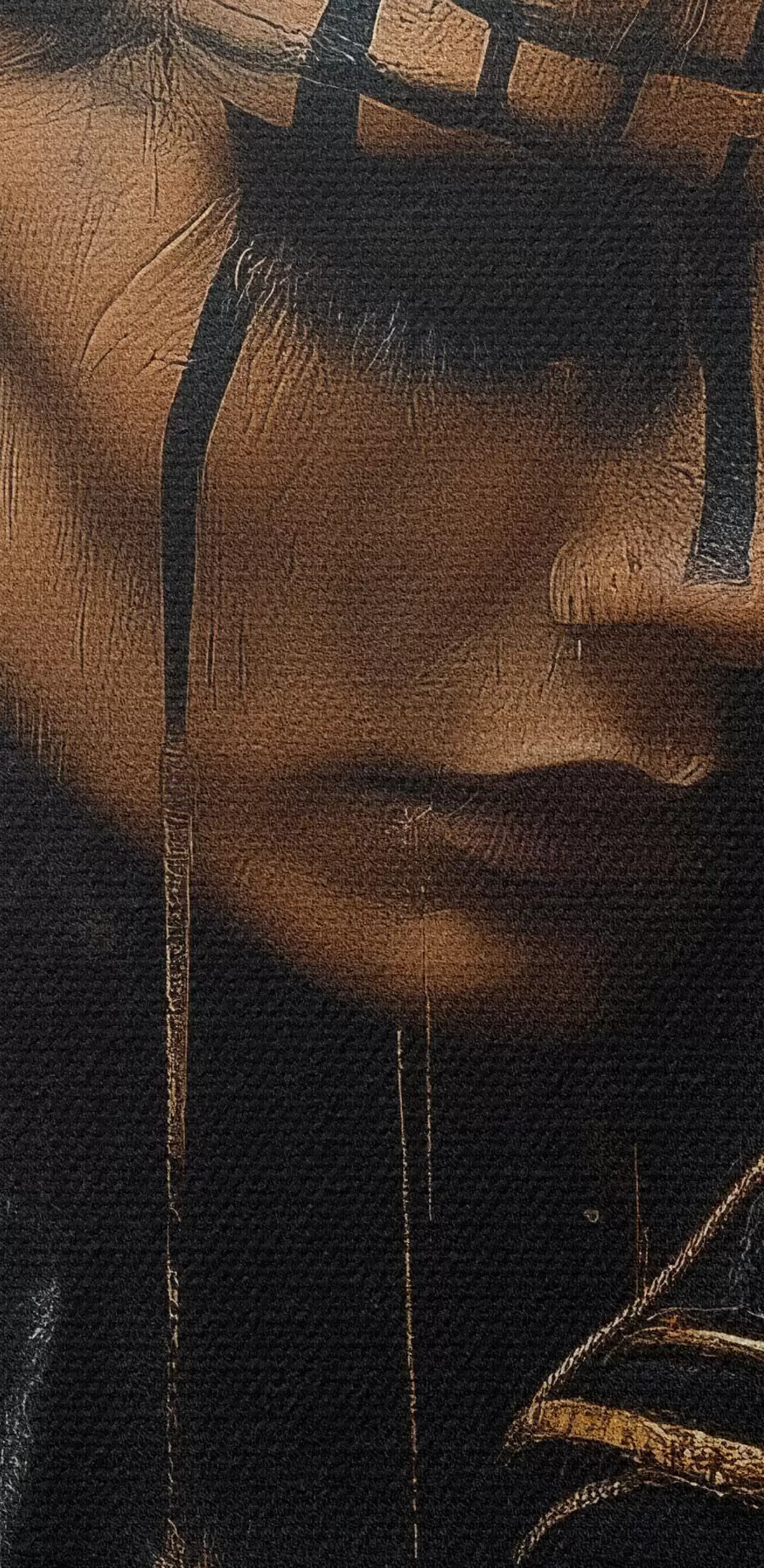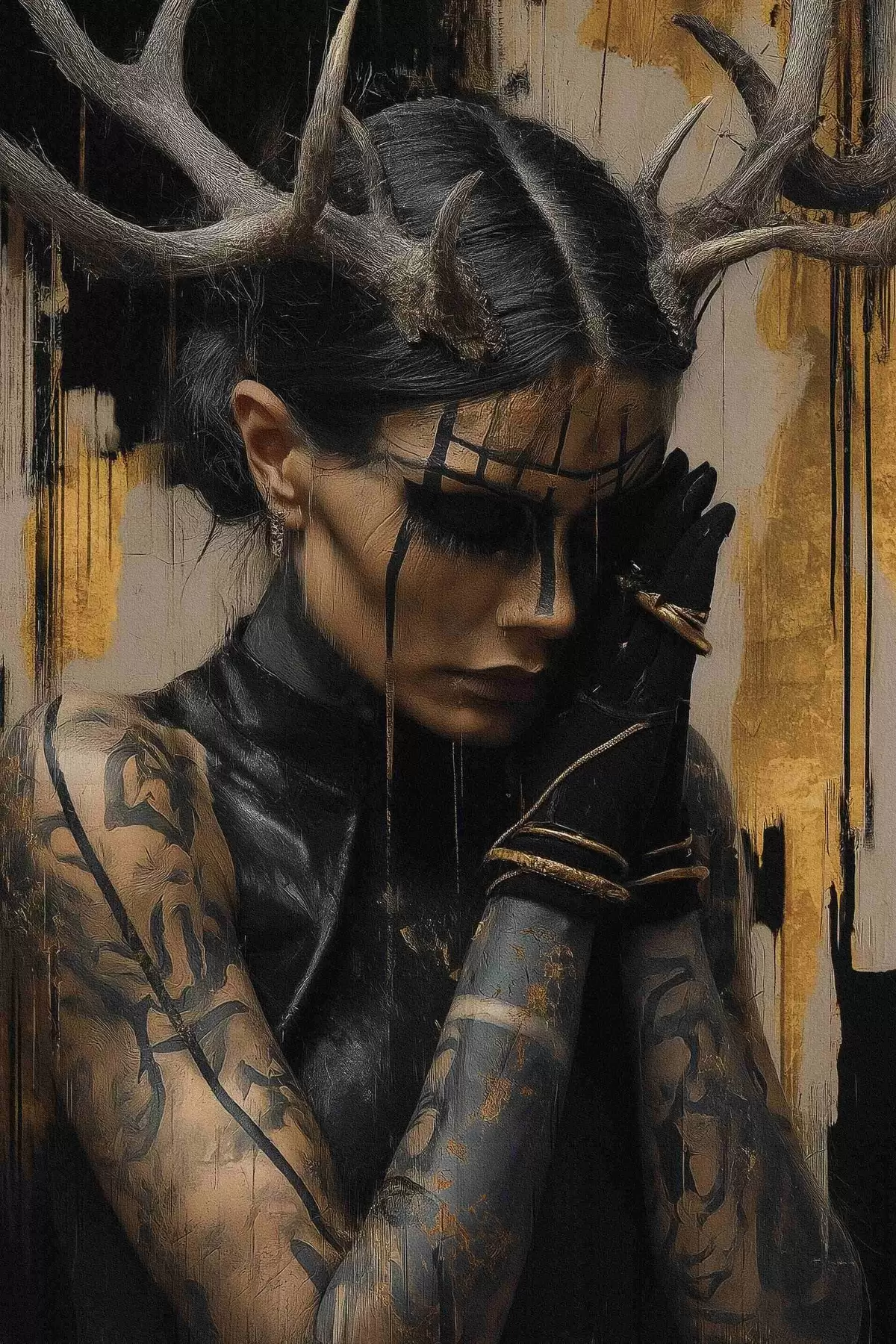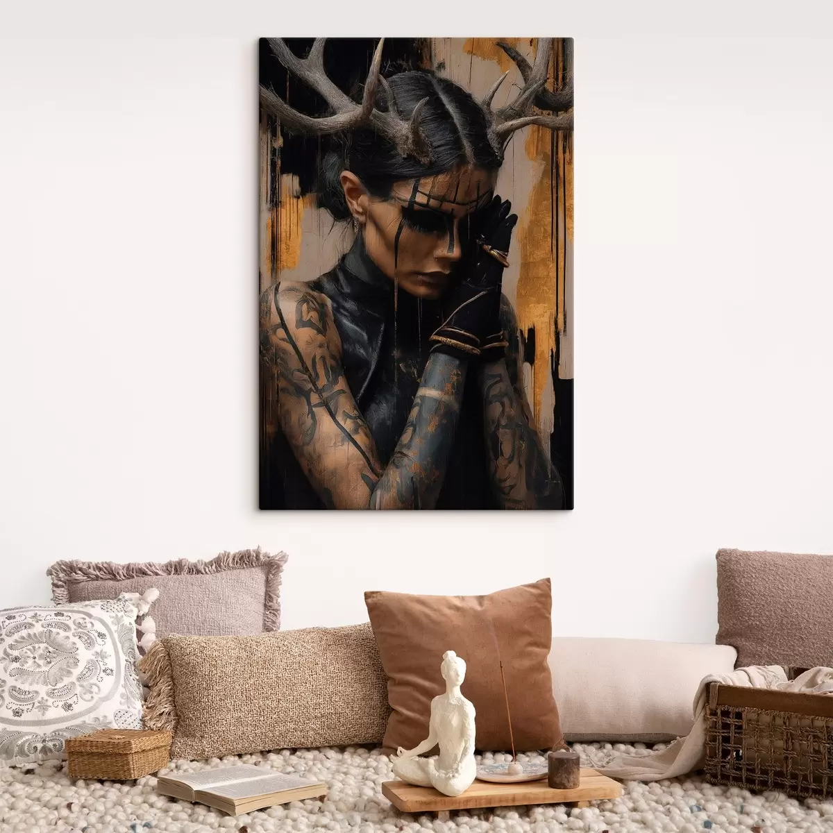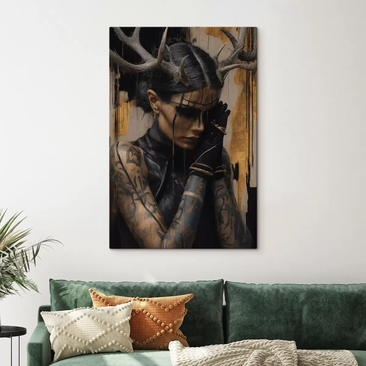 Schilderij Vrouw met hoorns in een donkere look met zwarte gezichtslijnen Art. s46144