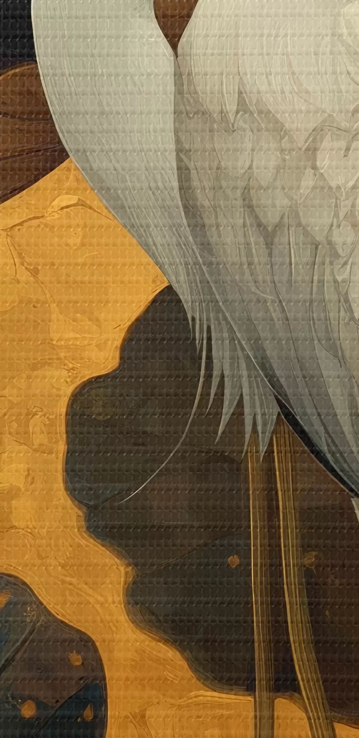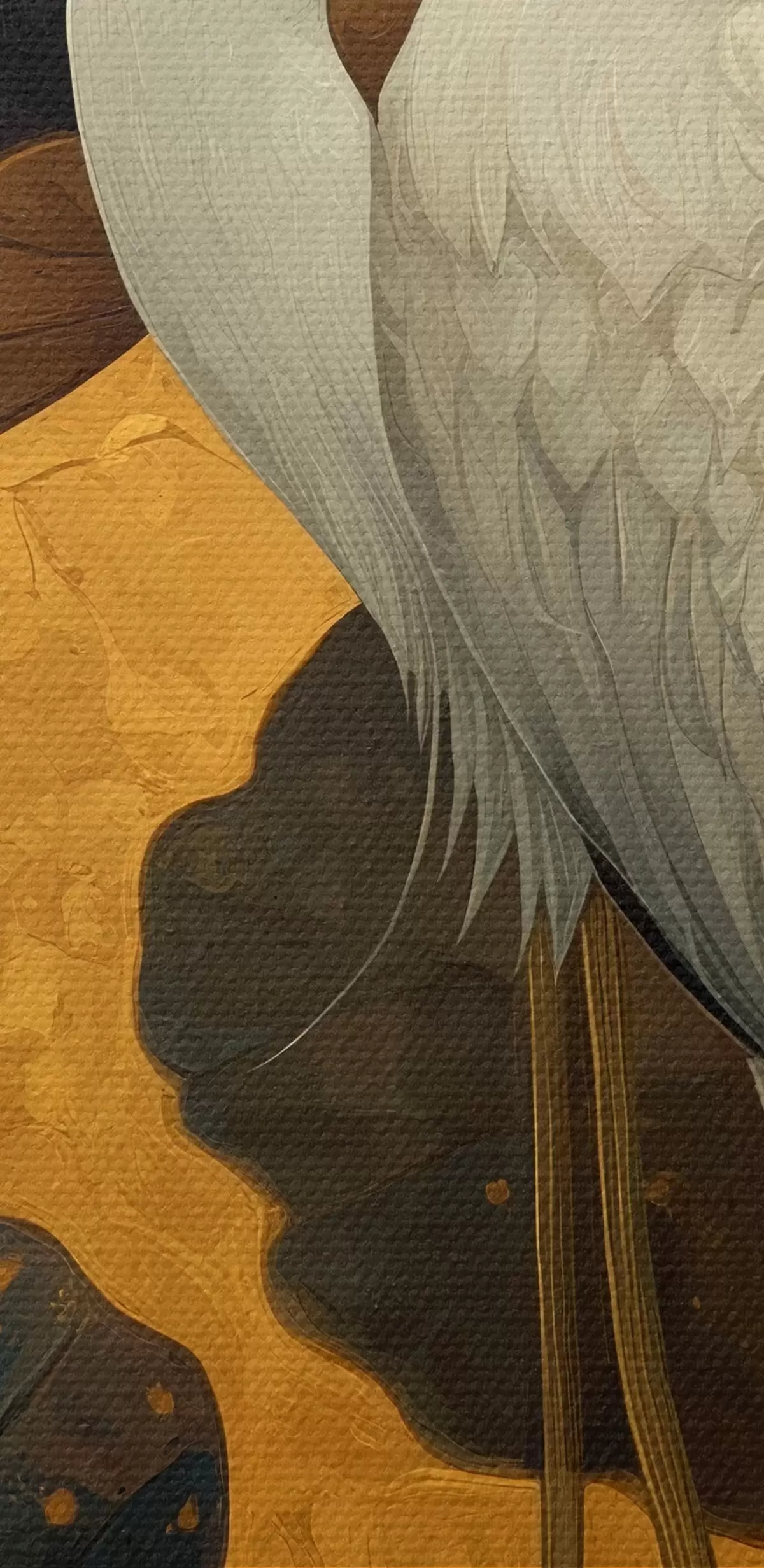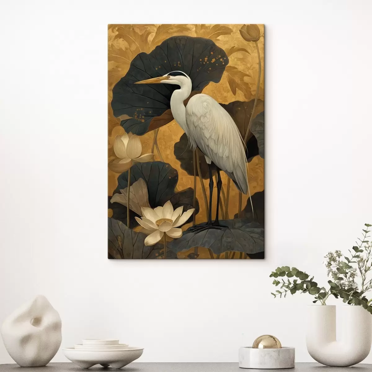 Schilderij Reiger tussen lotusbloemen op een warme achtergrond Art. s46148