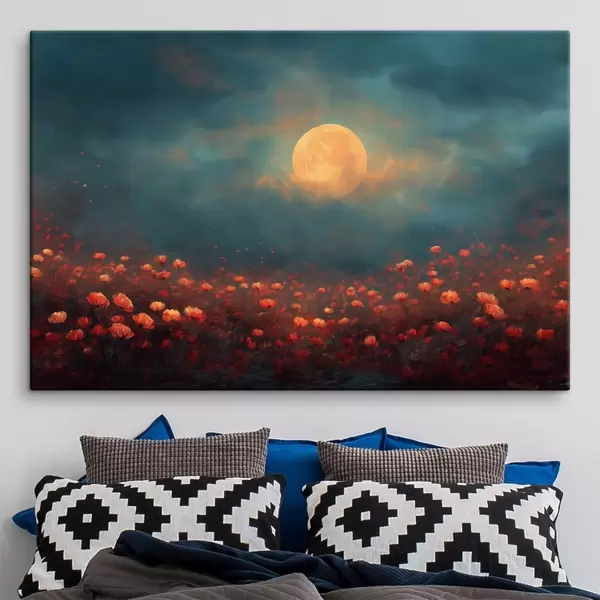Schilderij Maan boven een veld met rode bloemen in een mistige avondhemel Art. s46167