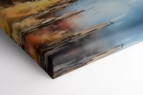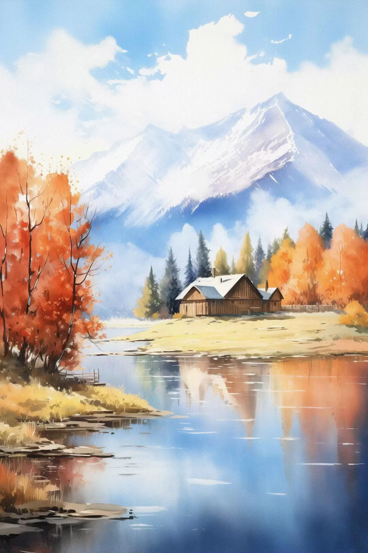Schilderij Herfstlandschap aan het meer met een huis en bergen Art. s46184