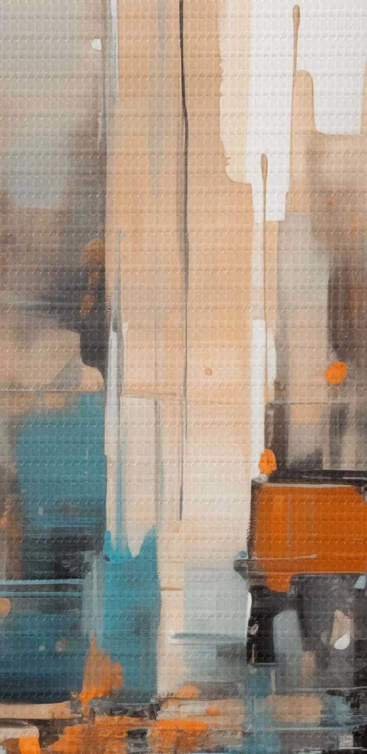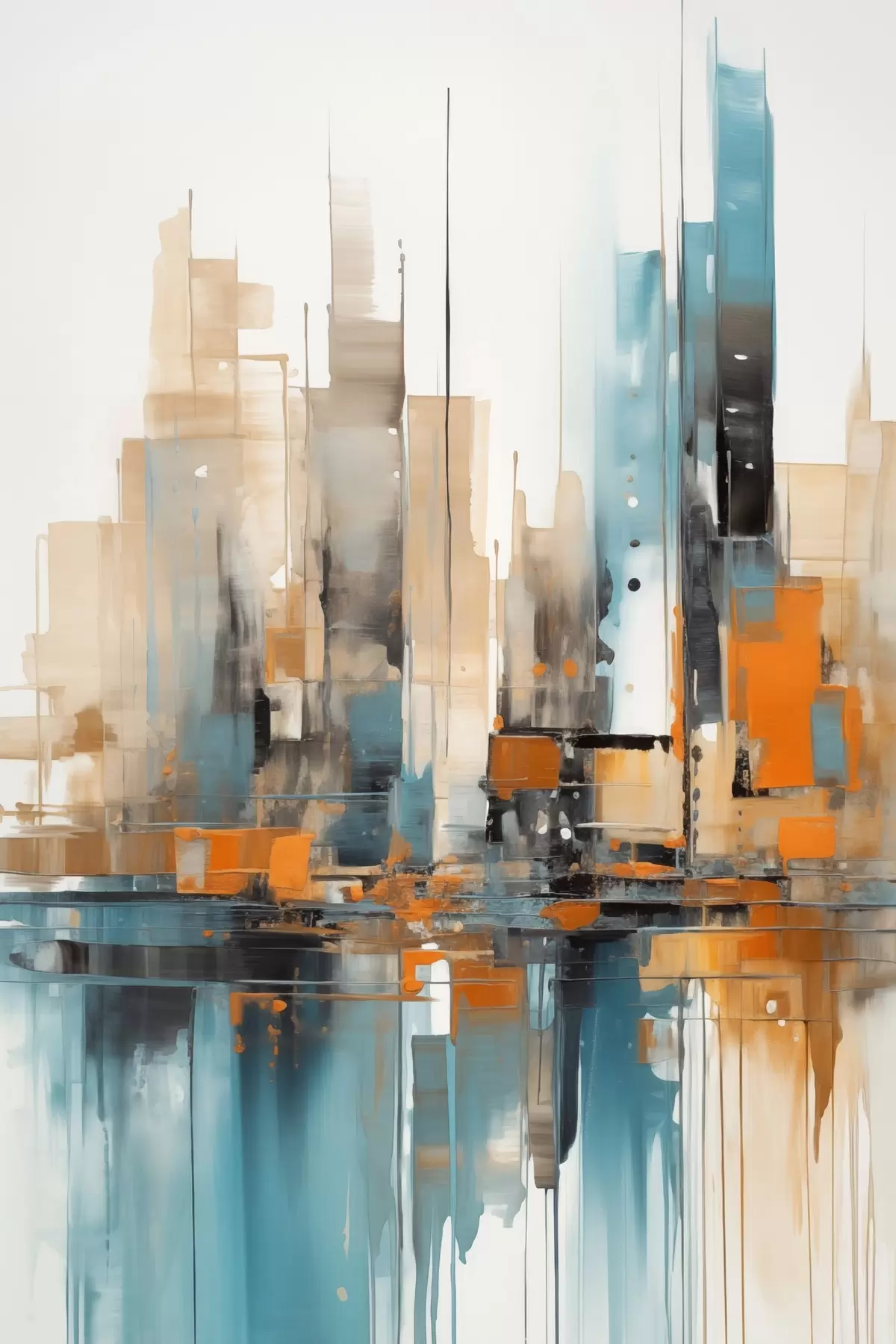 Schilderij Abstract stadsgezicht met oranje, blauwgroene en bruine verticale penseelstreken en geometrische vormen Art. s46266