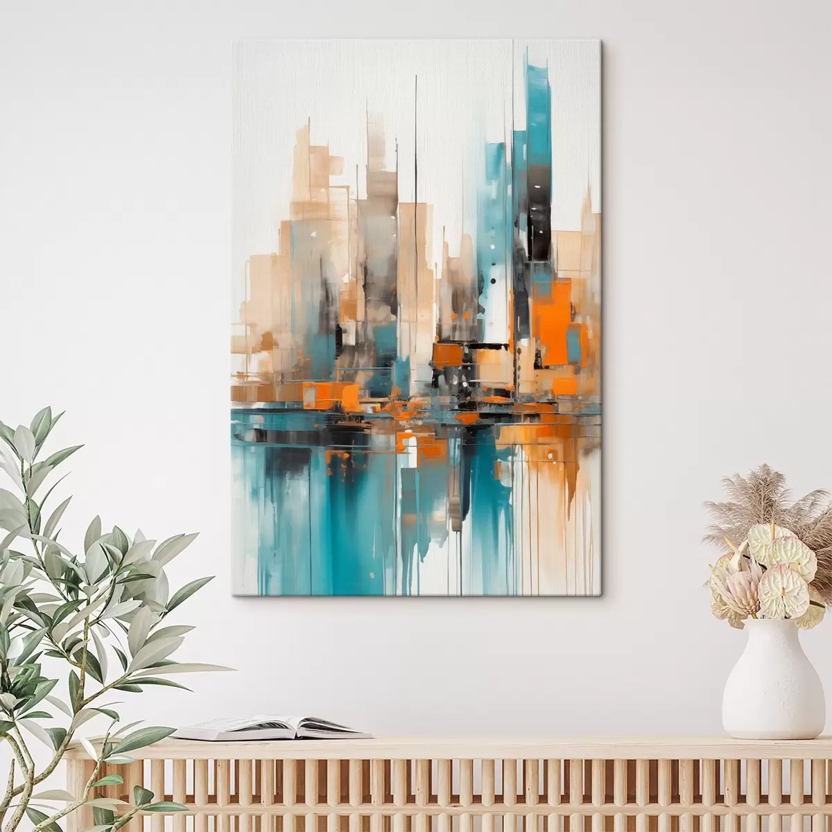 Schilderijen Abstract stadsgezicht met oranje, blauwgroene en bruine verticale penseelstreken en geometrische vormen s46266