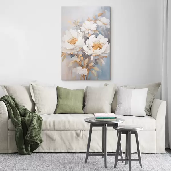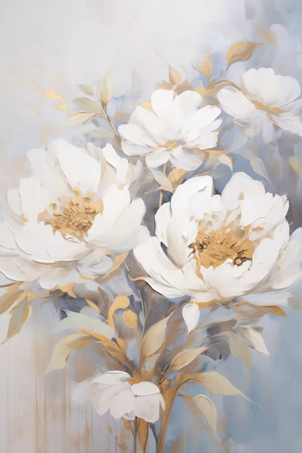 Schilderijen Witte pioenrozen met gele hartjes en bladeren, zachte penseelstreken, lichtblauwe achtergrond, bloemstuk s46270