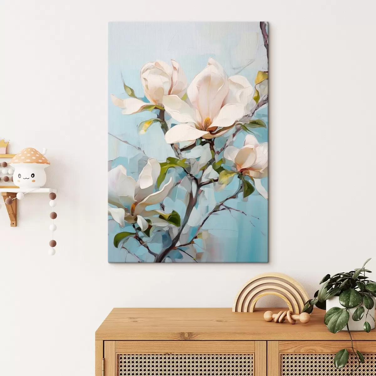 Schilderij Witte magnoliabloemen, lichtblauwe achtergrond met zachte penseelstreken, olieverfstijl, impasto-textuur Art. s46277