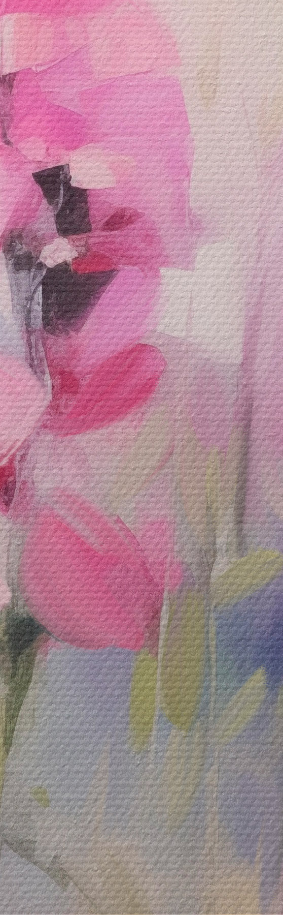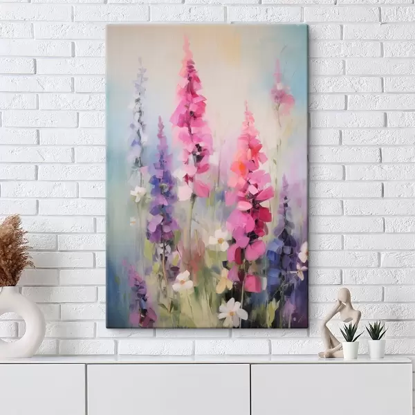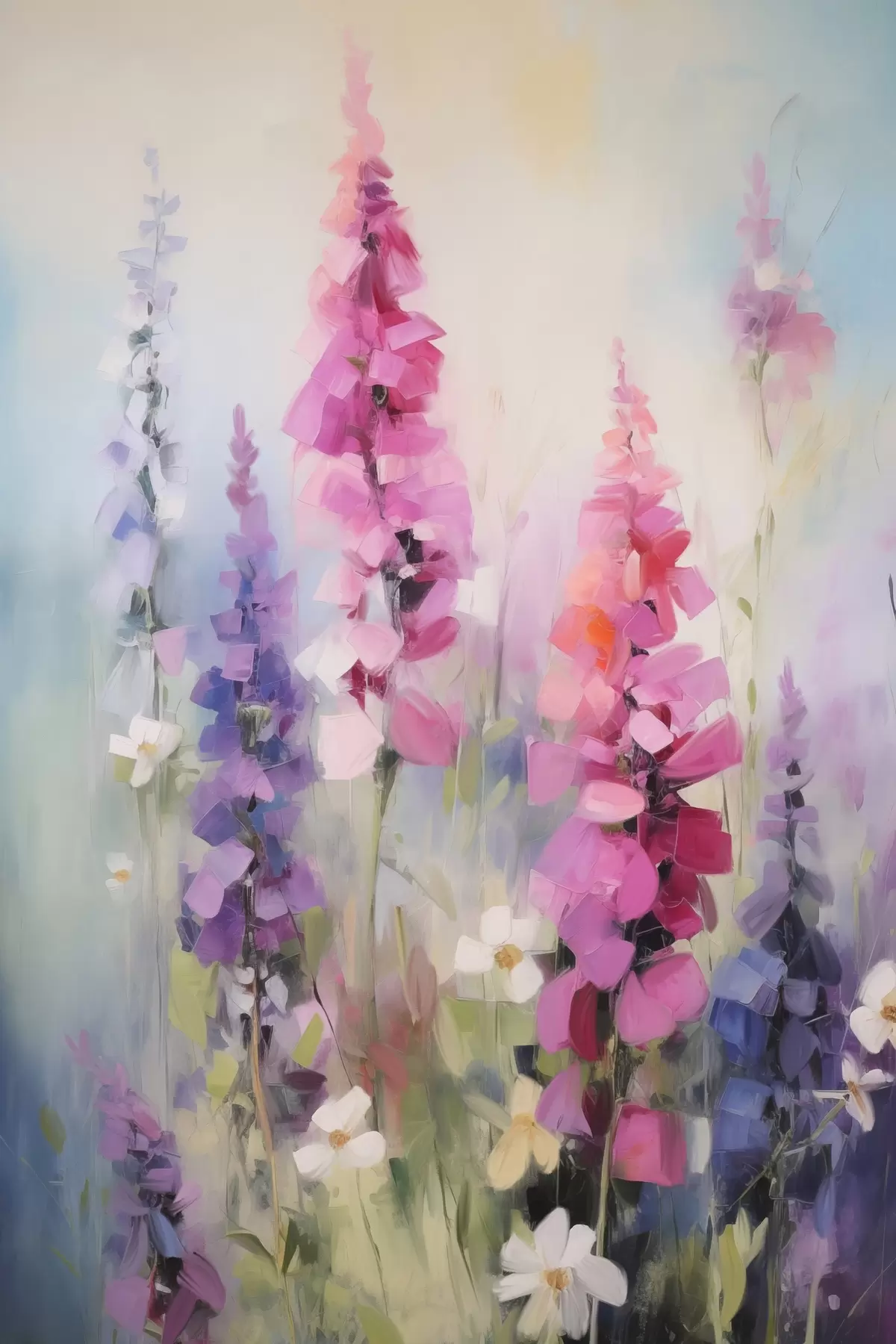 Schilderijen Roze en paarse bloemen met witte madeliefjes in een veld, zachte penseelstreken, pastelkleuren, impressionistische stijl s46279