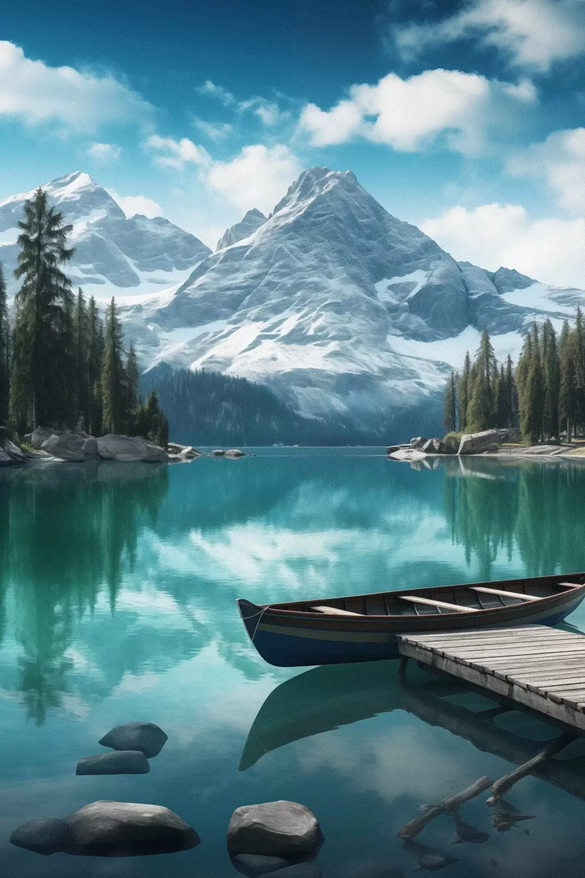 Schilderij Alpien meer met kano en besneeuwde bergtoppen Art. s46481
