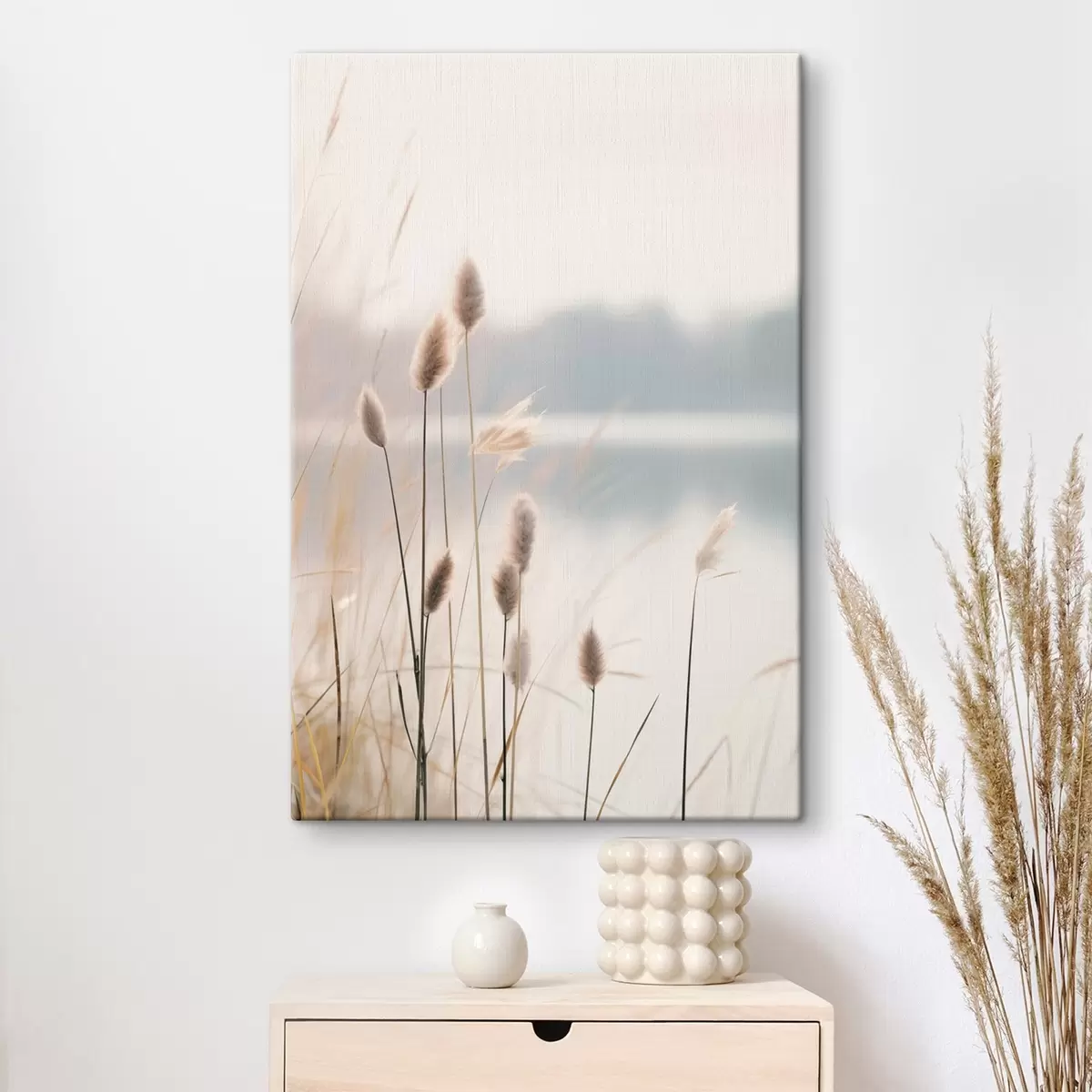 Schilderij Zachte rietkragen aan een mistige oever, pastelbeige tinten Art. s46504
