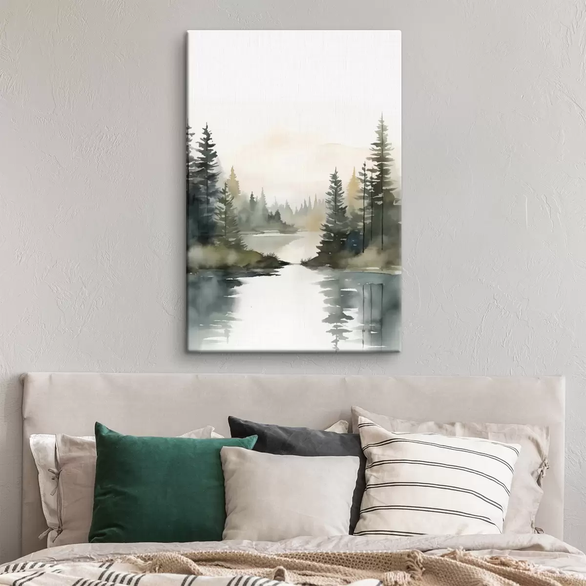 Schilderij Mistig naaldbos boven een rustige rivier, aquarelstijl Art. s46507