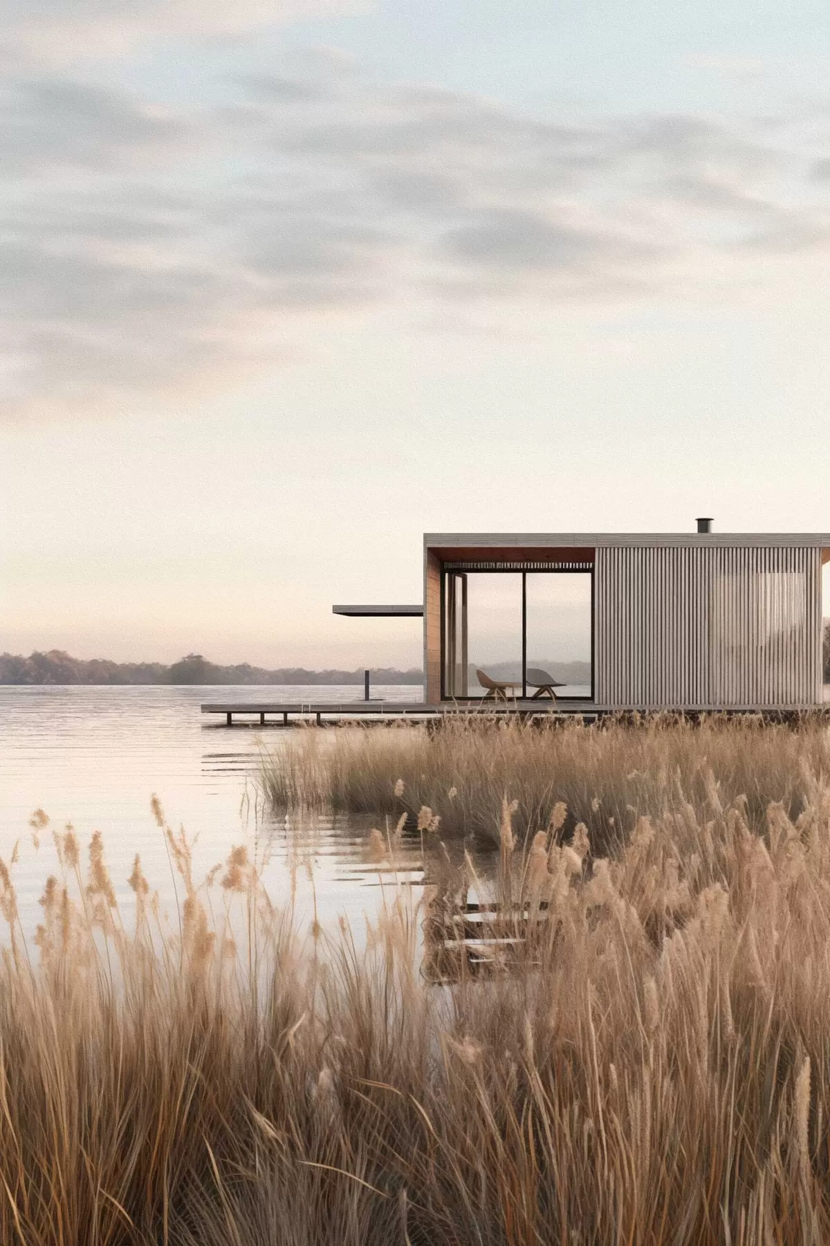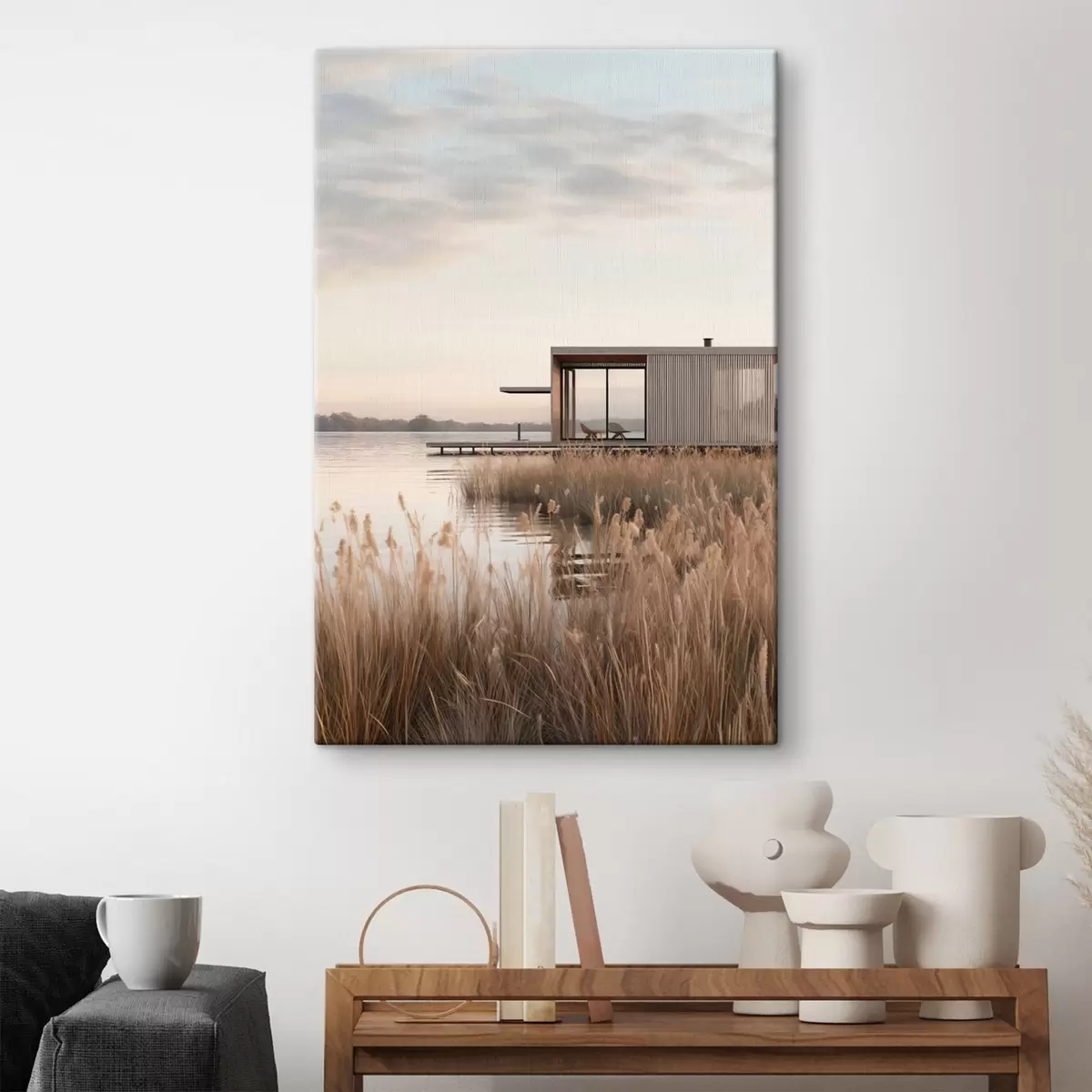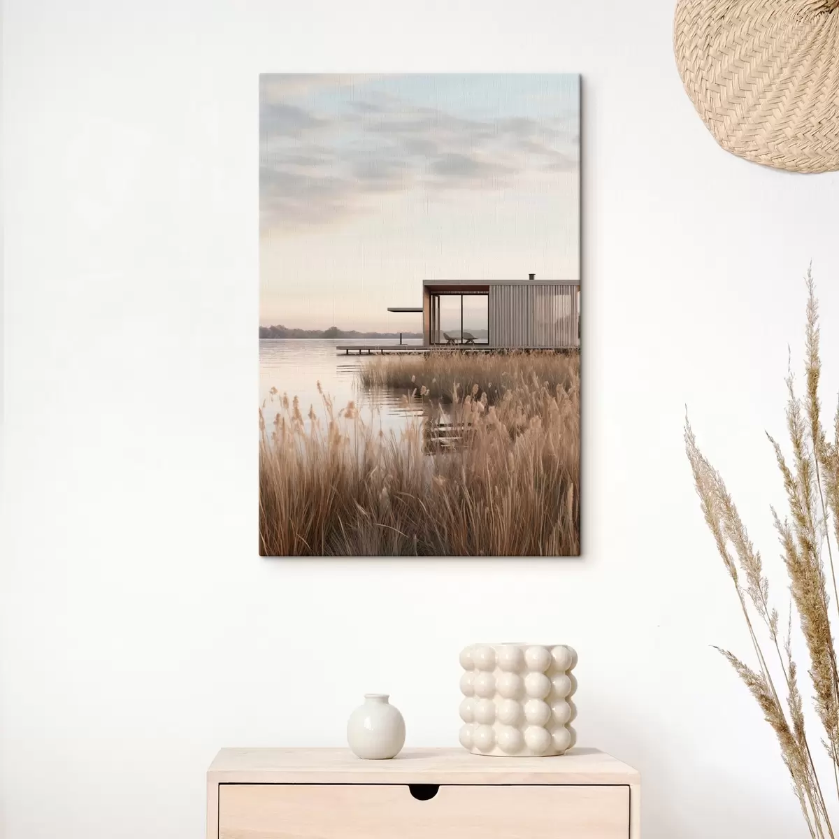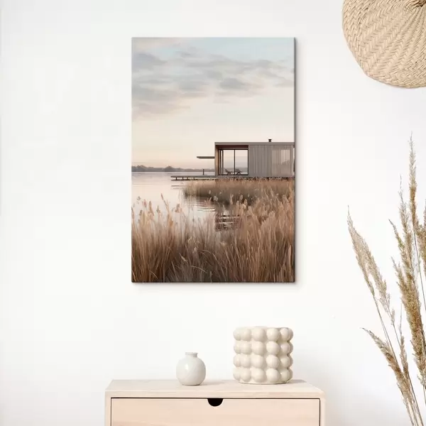 Schilderij Moderne hut aan het meer tussen het riet in de zachte schemering Art. s46513