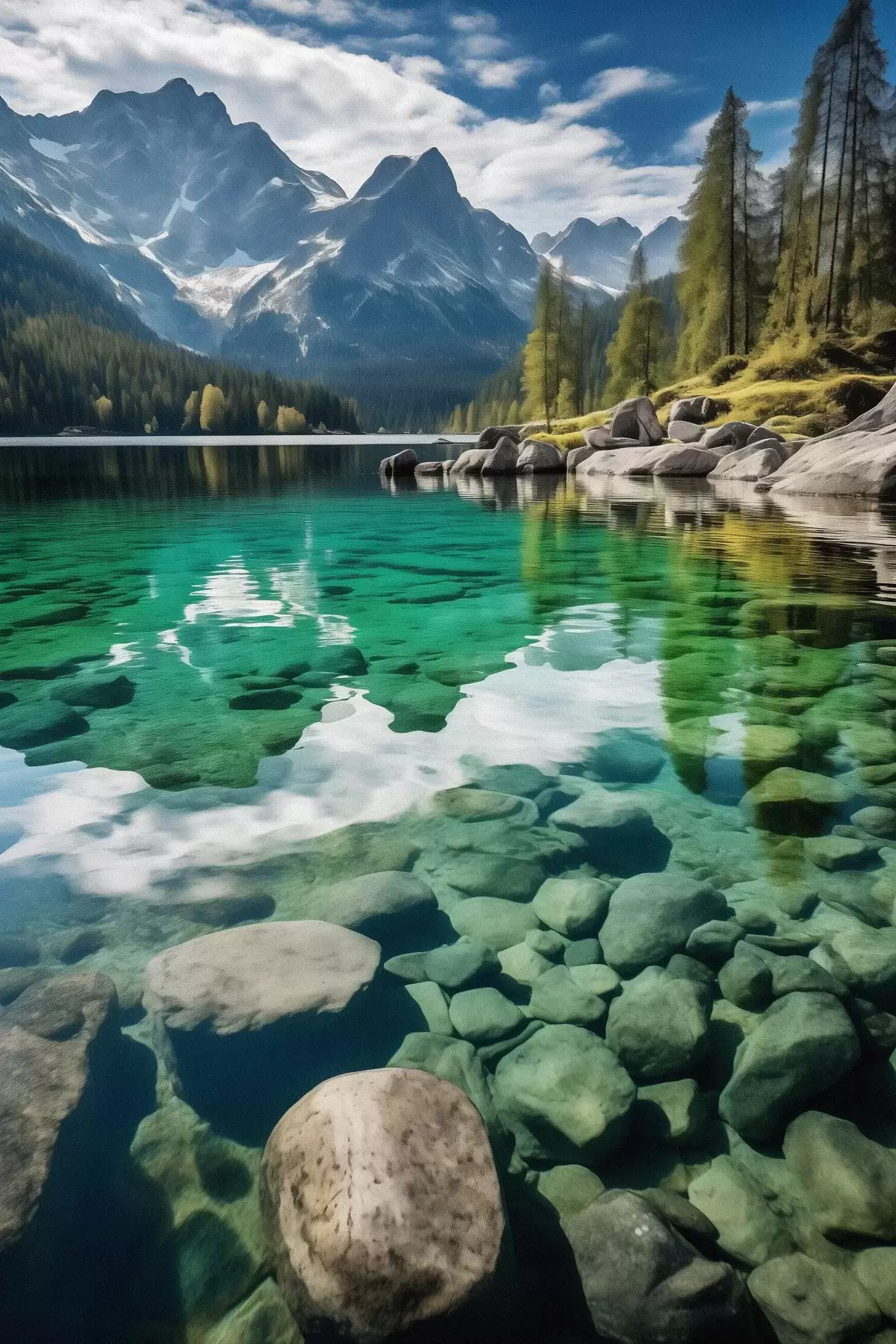 Schilderijen Smaragdgroen bergmeer met rotsen eronder en torenhoge bergtoppen s46515