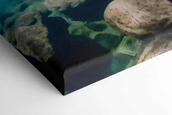 Schilderij Smaragdgroen bergmeer met rotsen eronder en torenhoge bergtoppen Art. s46515