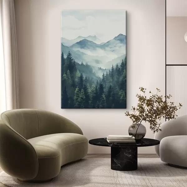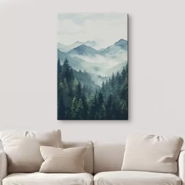 Schilderijen Aquarel van bergen en bos in zachte ochtendmist s46519