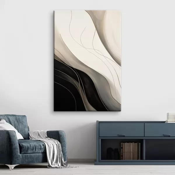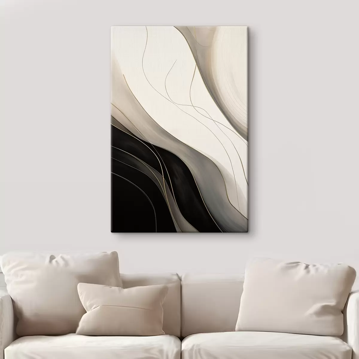 Schilderij Golven in zwart en beige met fijne okerkleurige lijnen Art. s46541