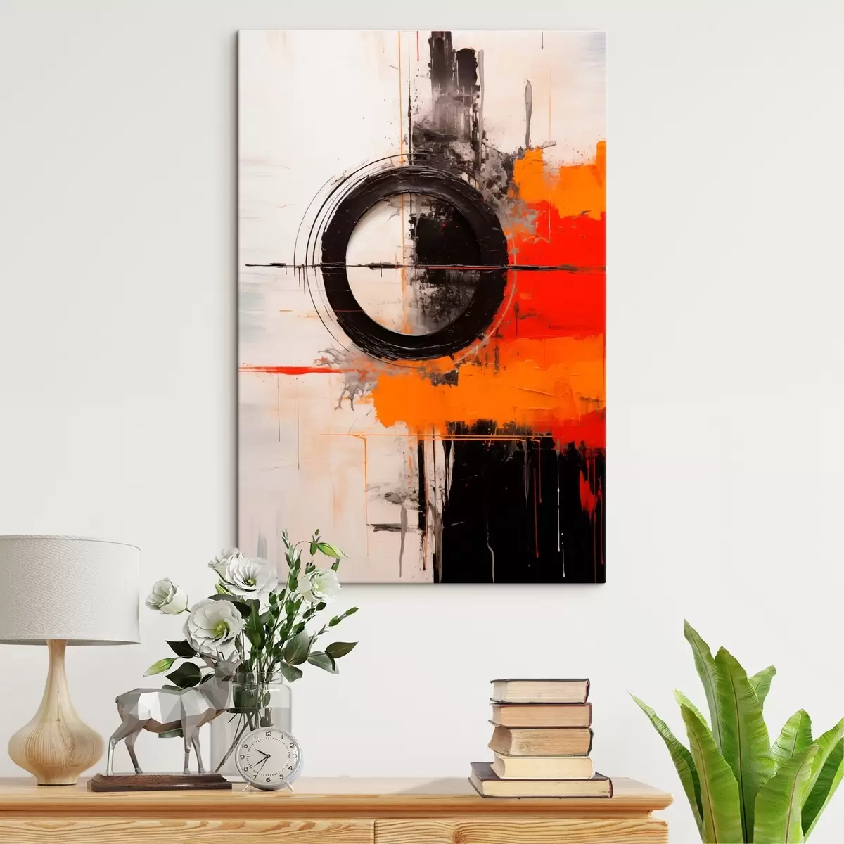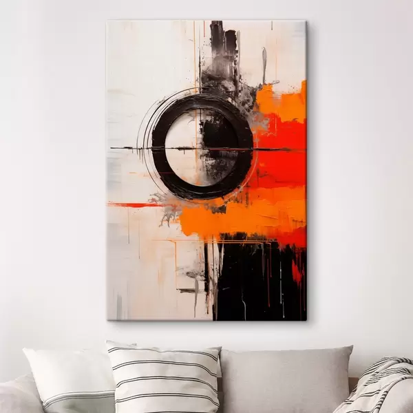Schilderij Zwarte cirkel op wit, oranje strepen en spatten Art. s46549