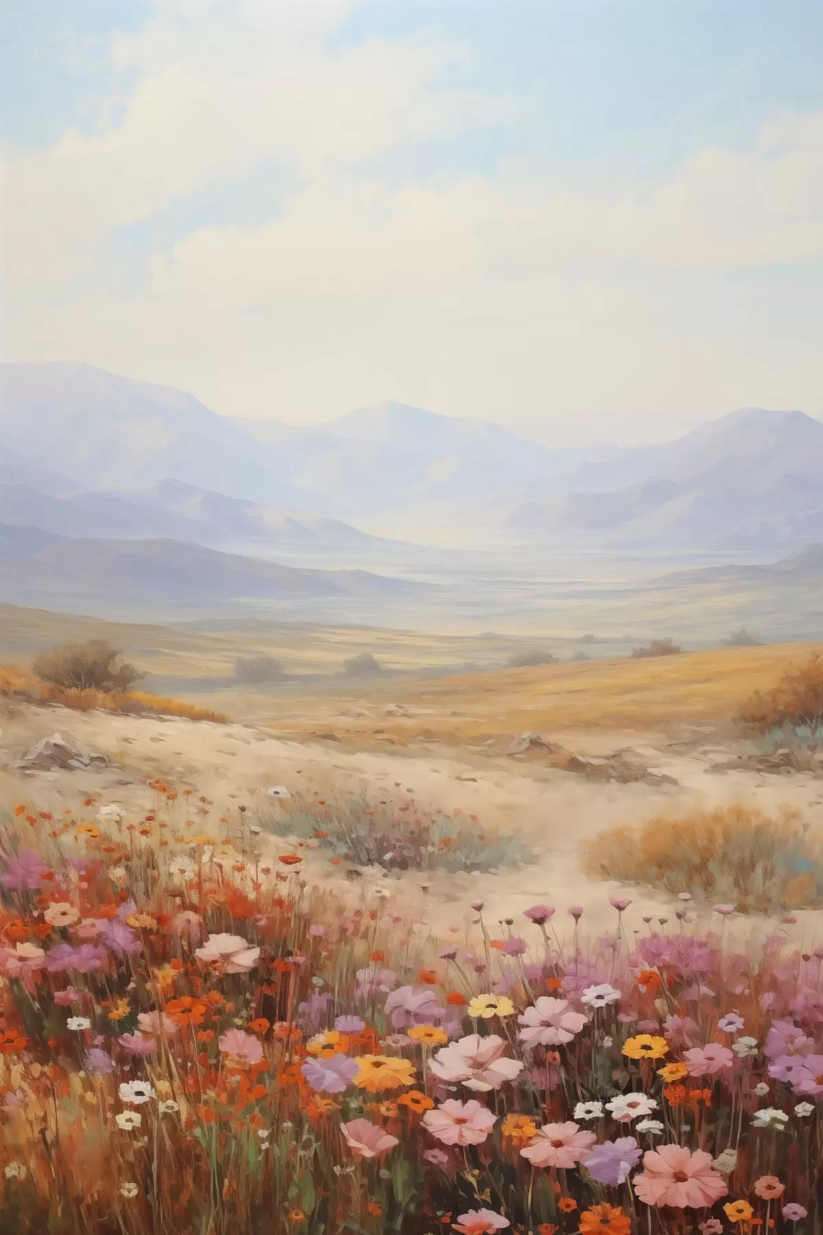Schilderijen Landschap, een veld met kleurrijke bloemen en bergen op de achtergrond, zachte pastelkleuren s46685