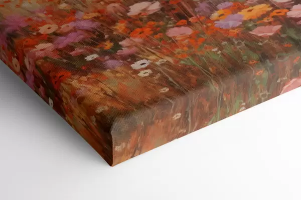 Schilderij Landschap, een veld met kleurrijke bloemen en bergen op de achtergrond, zachte pastelkleuren Art. s46685