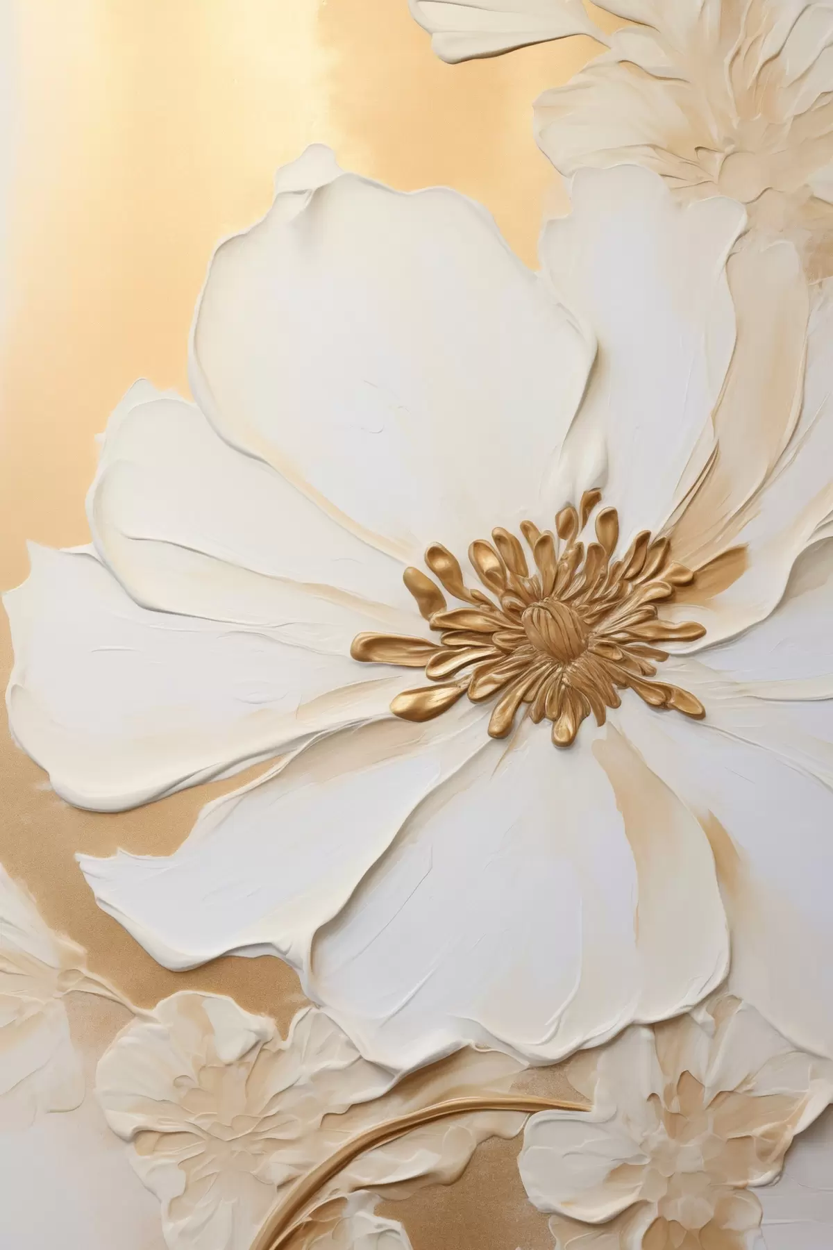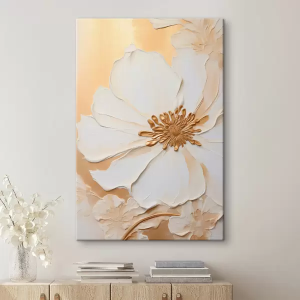 Schilderij Witte bloem met delicate bloemblaadjes met dikke penseelstreken imitatie, op een lichtoranje gestructureerde achtergrond Art. s46691